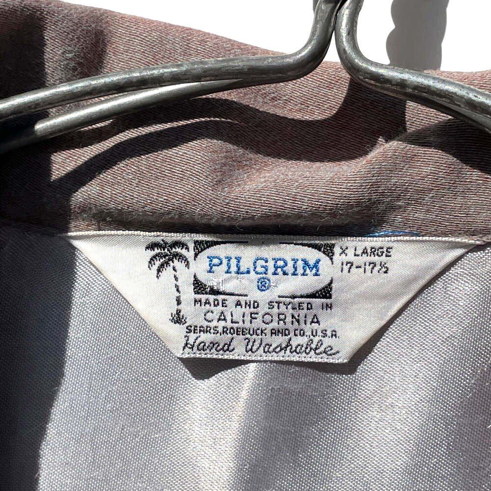 Around the 1950s, it is a rayon gabardine open collar shirt made by PILGRIM.