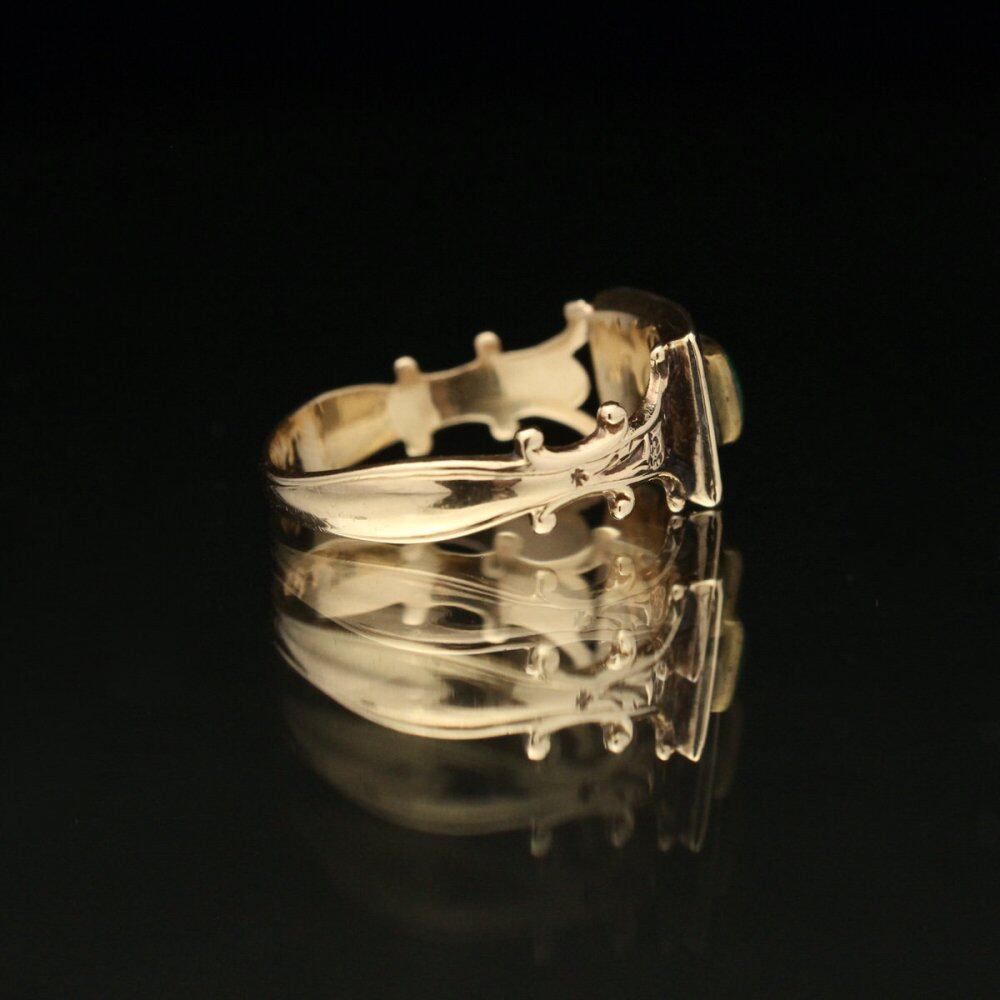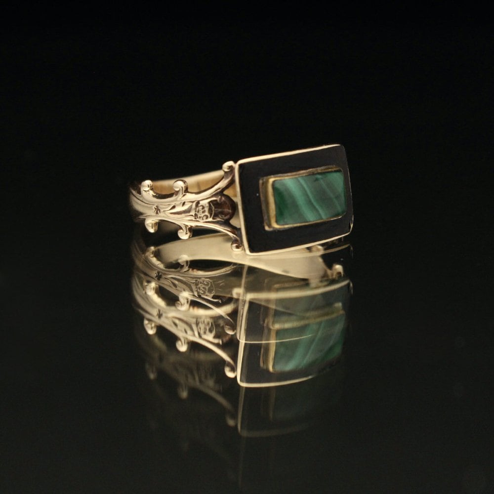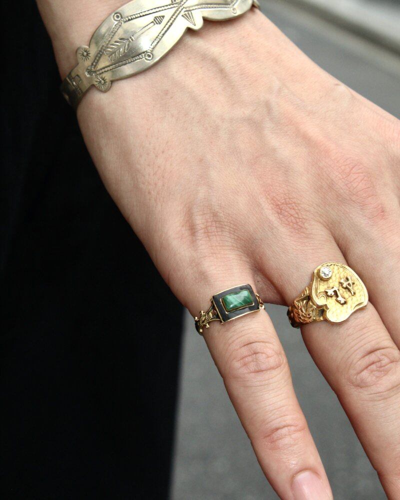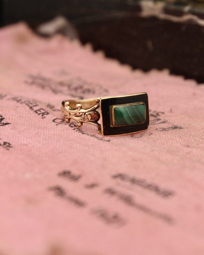 The morning ring was seen until the 19th century and was worn in mourning or in memory of the deceased and was sometimes handed out as an inheritance from the deceased. It is an antique with many designs that have a dubious atmosphere that is in line with the Memento Mori philosophy and has many collectors. This is probably made in the USA because malachite is used (purchased in the USA), and the designed hoop, black enamel, and malachite top give it an antique-like dignity. There is no hallmark, but it is probably 14 karat gold. Please check the condition in the photo and understand the characteristics of vintage before purchasing.