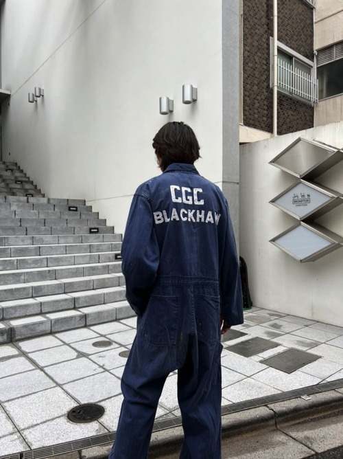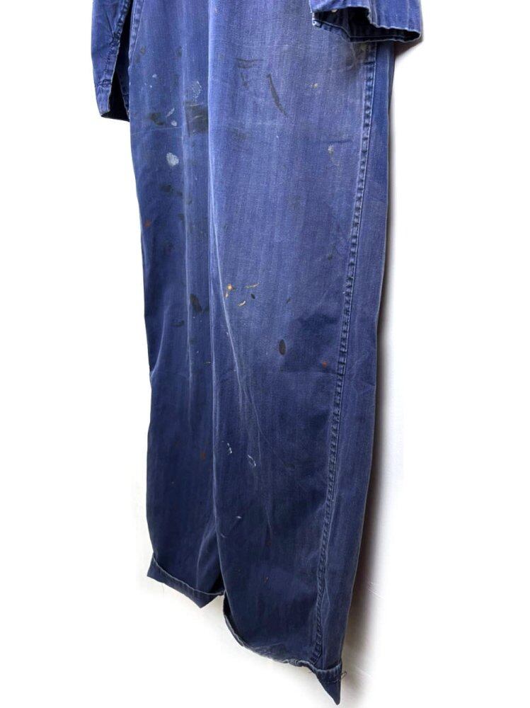 70s vintage all-in-one navy color herringbone twill fabric that has faded with age The paint stains here and there are a work item with a realistic and masculine texture. A vintage all-in-one with an outstanding silhouette
