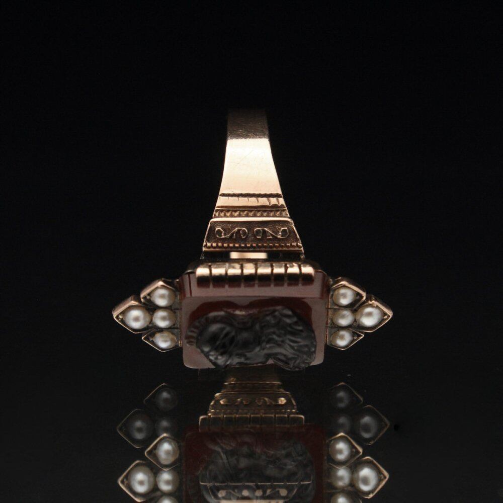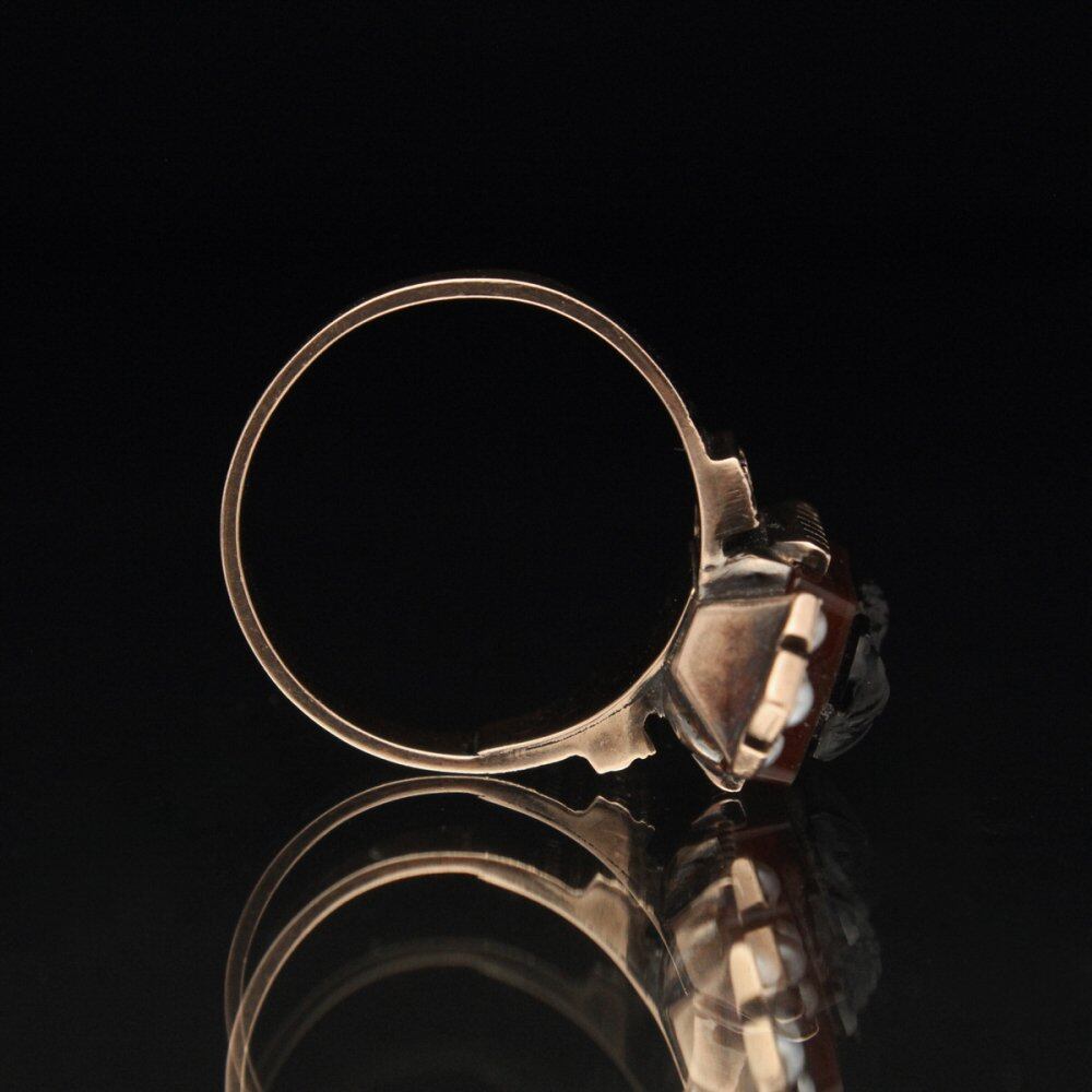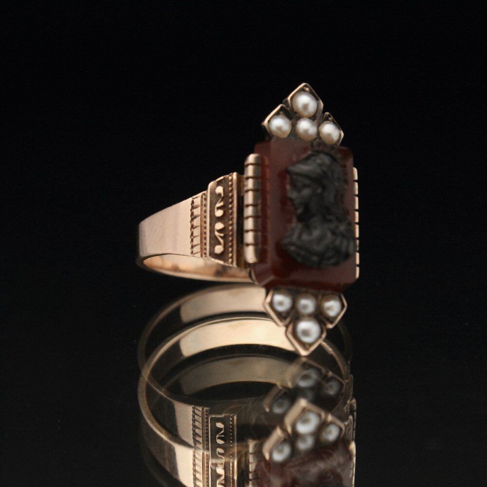 A cameo ring from the 1930s in terms of design. Cameo rings have been popular among wealthy people in Europe since the 14th century, often carved with gods and Roman soldiers from ancient Greece and mythology. This is a rare specification in which pearls that follow the design of the Georgian period are set in a cluster shape while making you feel the remnants of Art Deco. The top is made of high-quality carnelian, giving it an antique and elegant taste. I cant see the hallmark but its probably 10kt gold. Please check the condition in the photos and understand the characteristics of vintage before purchasing.