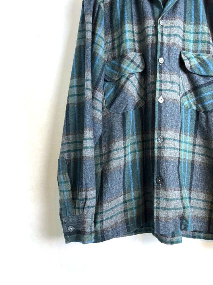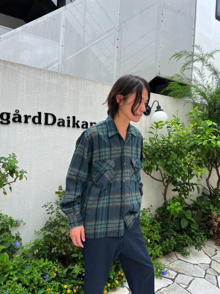Wool shirt from the 70s Sax blue, gray and green check pattern with a subdued atmosphere A moderately roomy size with a masculine box silhouette