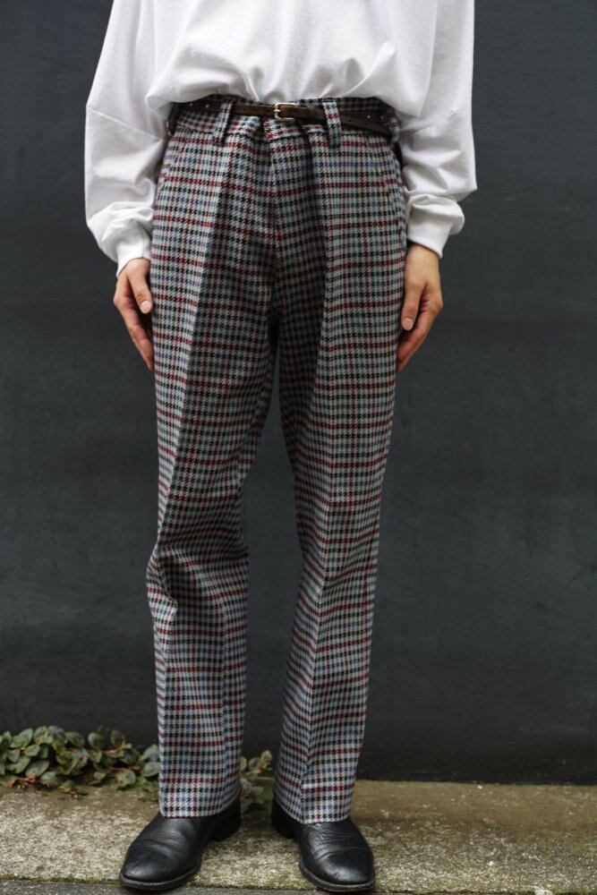Around the 1970s, houndstooth check overall pattern flared pants.