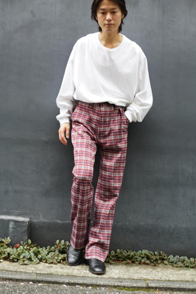 Around the 1970s, it is a Madras check pattern flared pants made by HAGGAR.