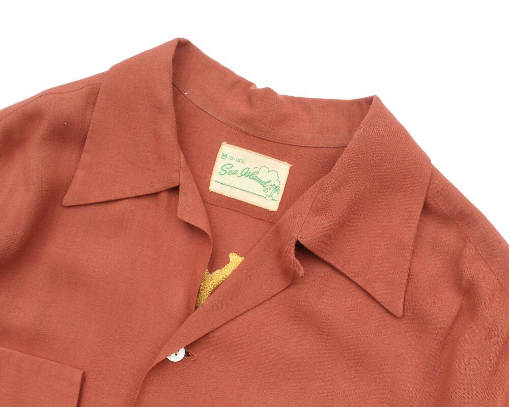 Open collar shirt from the 1950s. Rare rayon material specifications in recent years, smooth and soft satin fabric has a comfortable texture. The terracotta color that gives you the feeling of the old days gives it a vintage look. Probably a uniform or a bowling shirt. Although it is a size M, it has a loose and relaxed silhouette. This vintage is in rare condition. Since it is an old item, it rarely deteriorates over time. Please check the photos and understand the characteristics of vintage before purchasing.