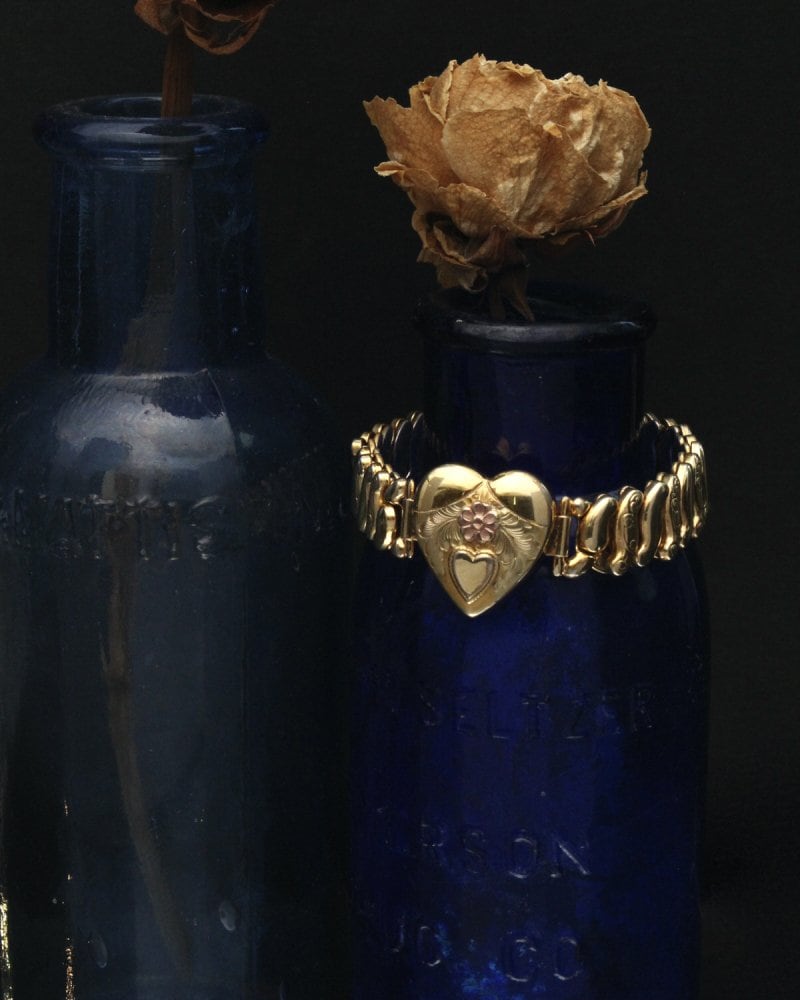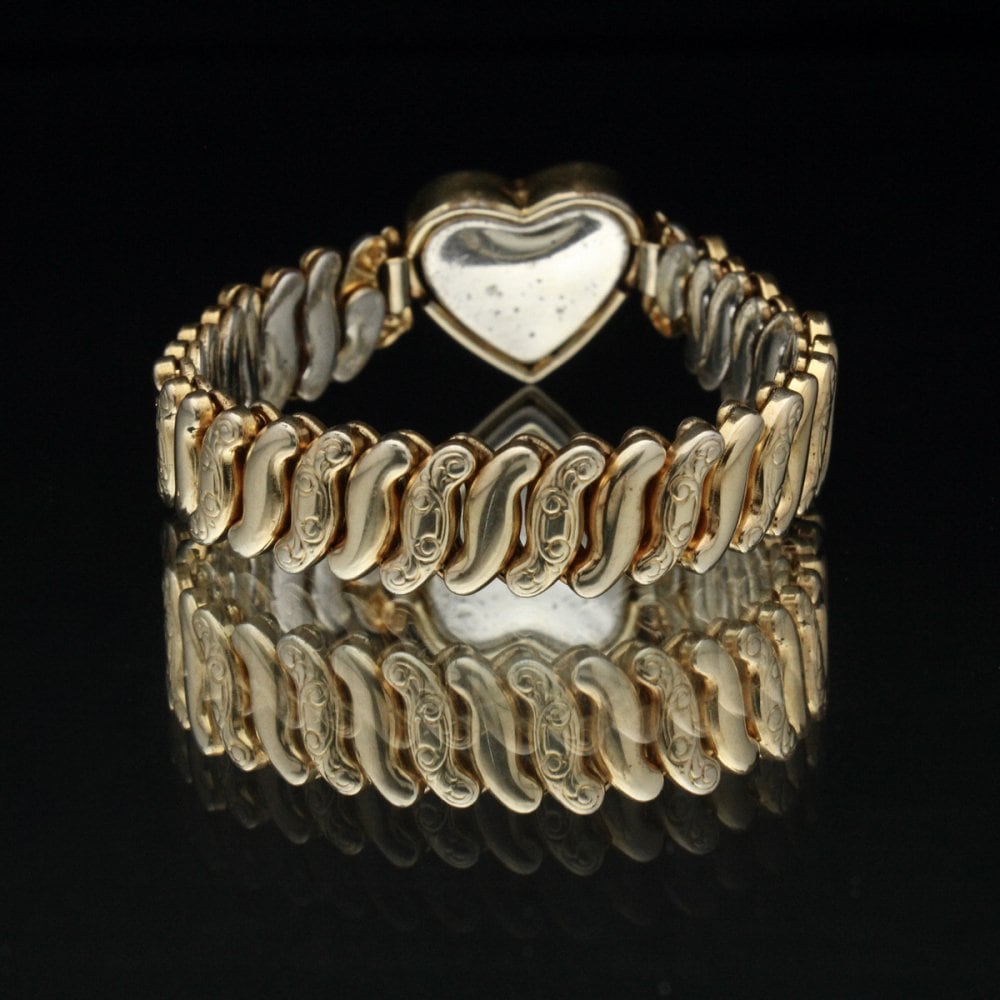 From the early 1900s to World War II, this item was given as a gift by couples during the war. The elastic bellows mechanism bracelet, which is not made today, provides a moderate fit and is thickly gold-plated, and its gorgeous and delicate construction creates a vintage-like dignity and luxury atmosphere. The body looks a little dull over time, giving it a more antique appearance. The precious sterling silver base and delicate engraving are also more elegant. Since it is old, there are dullness over time and fine scratches. Please check the photos and understand the characteristics of vintage before purchasing.