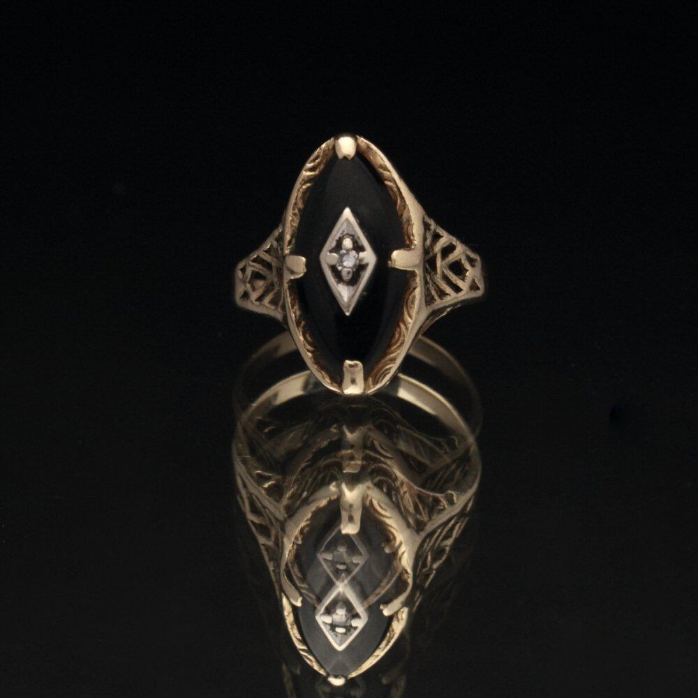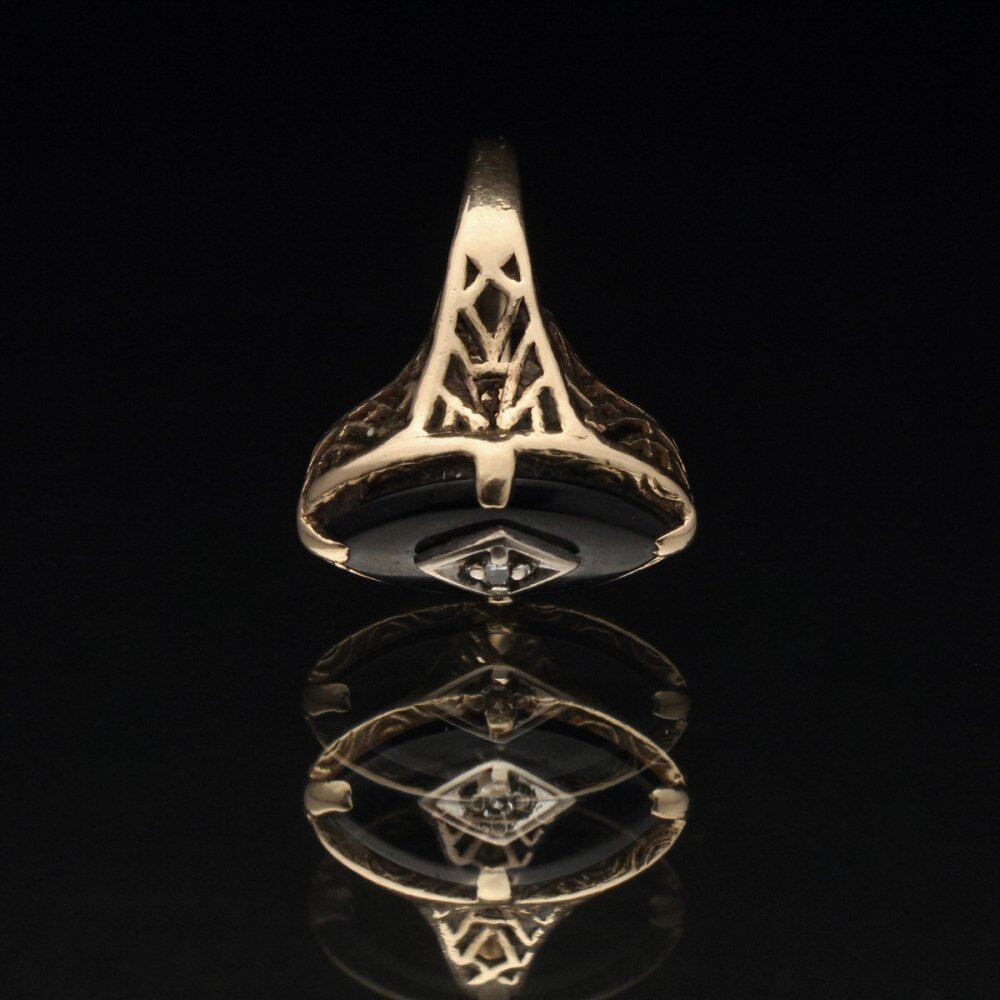The antique dress ring and art deco watermark carving on the upper surface give it a dignified look that is typical of this era. Onyx has a solemn atmosphere, and diamonds (or simulants) have a casually elegant flavor, although we do not have an appraisal. Although the stamp has disappeared, it is 10kt gold and a rare pinky size. Please check the condition in the photo and understand the characteristics of vintage before purchasing.