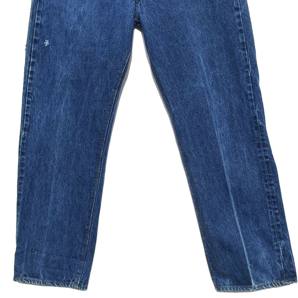 Factory code 6, back pocket back chain stitch, red tab small e, shrinkage 8%, frayed left thigh.