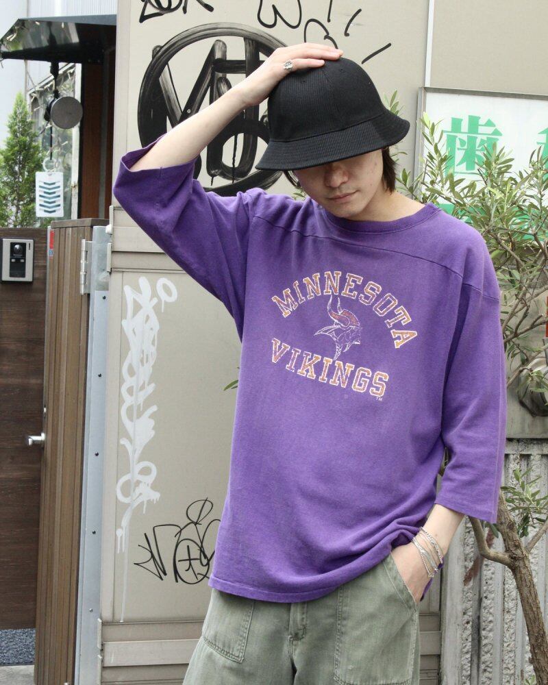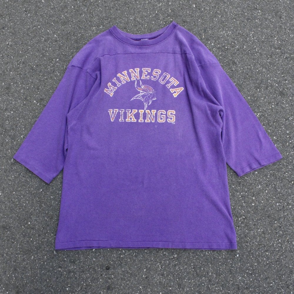1980s champion tricot tag football jersey. The 100% cotton fabric has been aged to give it a soft texture, and the eye-catching purple color has faded to give it a vintage look. The yellow varsity print is also faded, making the original design stand out even more. L size with moderately relaxed silhouette. Quality: Cotton Color: Purple SIZE: L [Size] Shoulder Width: 61 cm Width: 55 cm Sleeve Length: 37 cm Length: 71 cm [Model Size] Height: 175 cm Shoulder Width: 43 cm B (Chest): 85 cm W (Waist): 71cm Since it is an old item, it rarely deteriorates over time. Although we try to make the product photos as close to the actual color as possible, the color of the actual product may differ depending on your monitor settings, room lighting, etc. Please check the photos and understand the vintage characteristics before purchasing. ※Please refer to here for the measuring method.