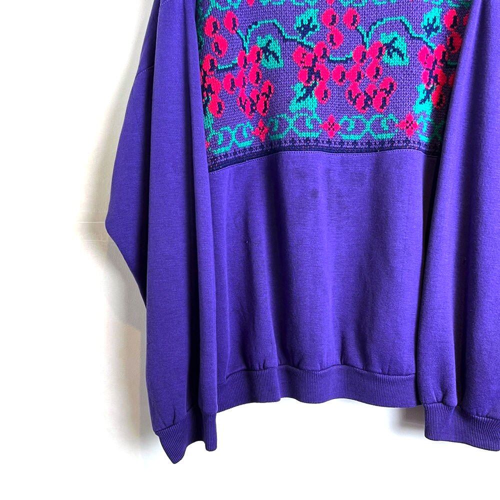 Sweatshirt from the 90s A unique vintage sweatshirt with a knit material on the front of the chest A cute piece with a knitted botanical pattern in an eye-catching vivid purple color A good silhouette with just the right amount of room