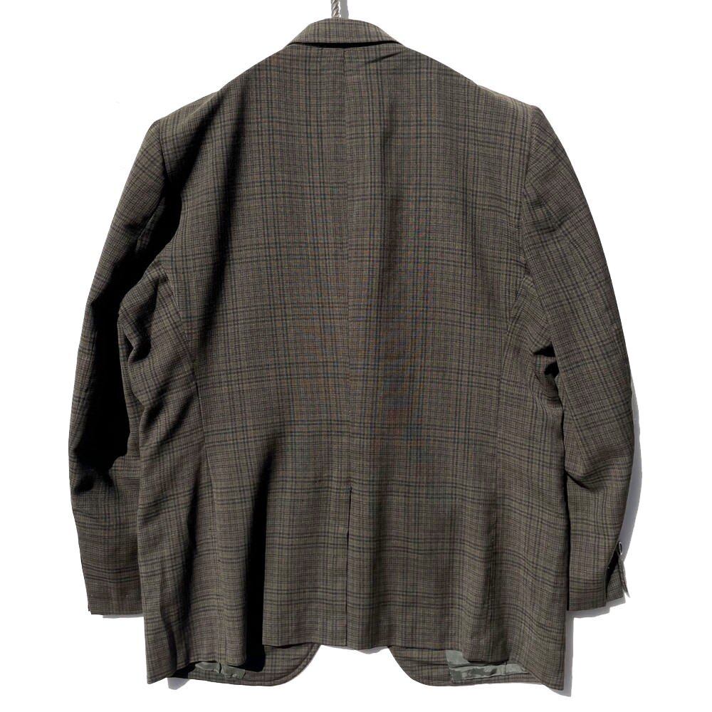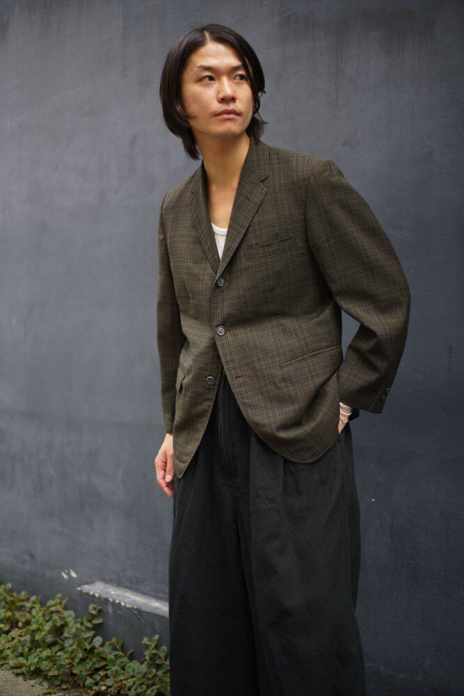 The 60s-like narrow V zone gives a vintage feel, and the dark brown wool fabric has a light texture with just the right amount of firmness.<BR> The mannishness of the box silhouette of the time remains, but the softness of the fabric gives it a soft line that follows the body and a relaxed silhouette.