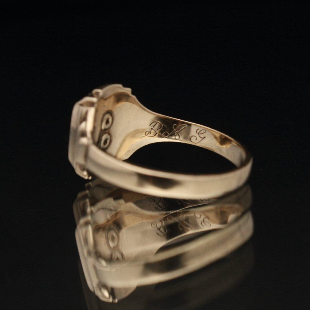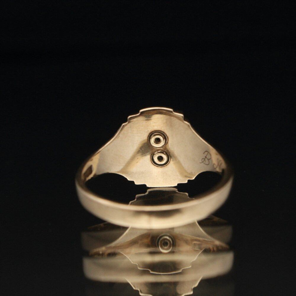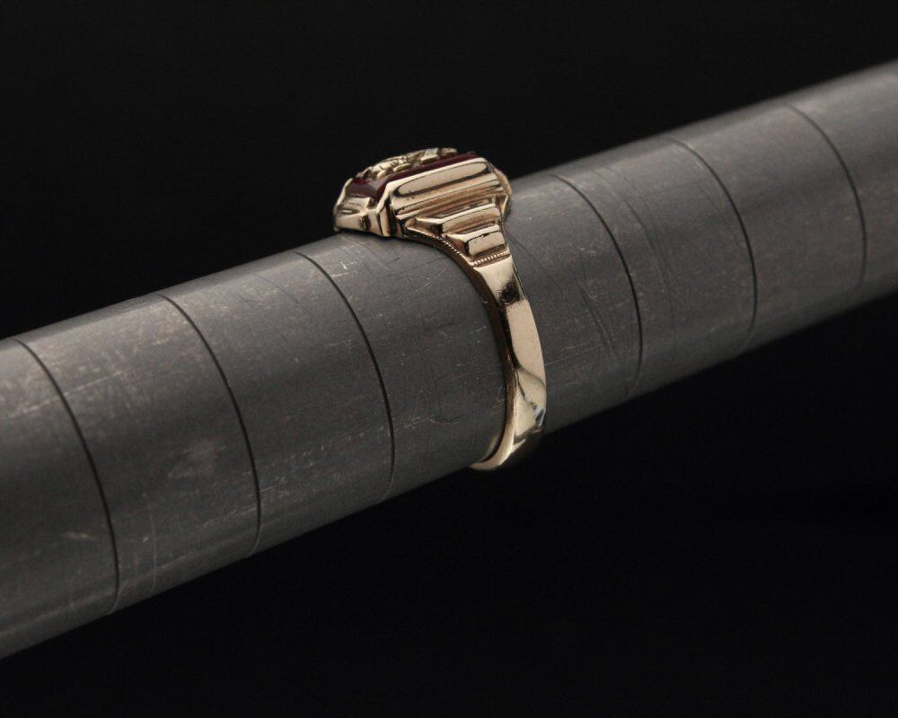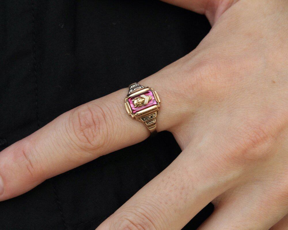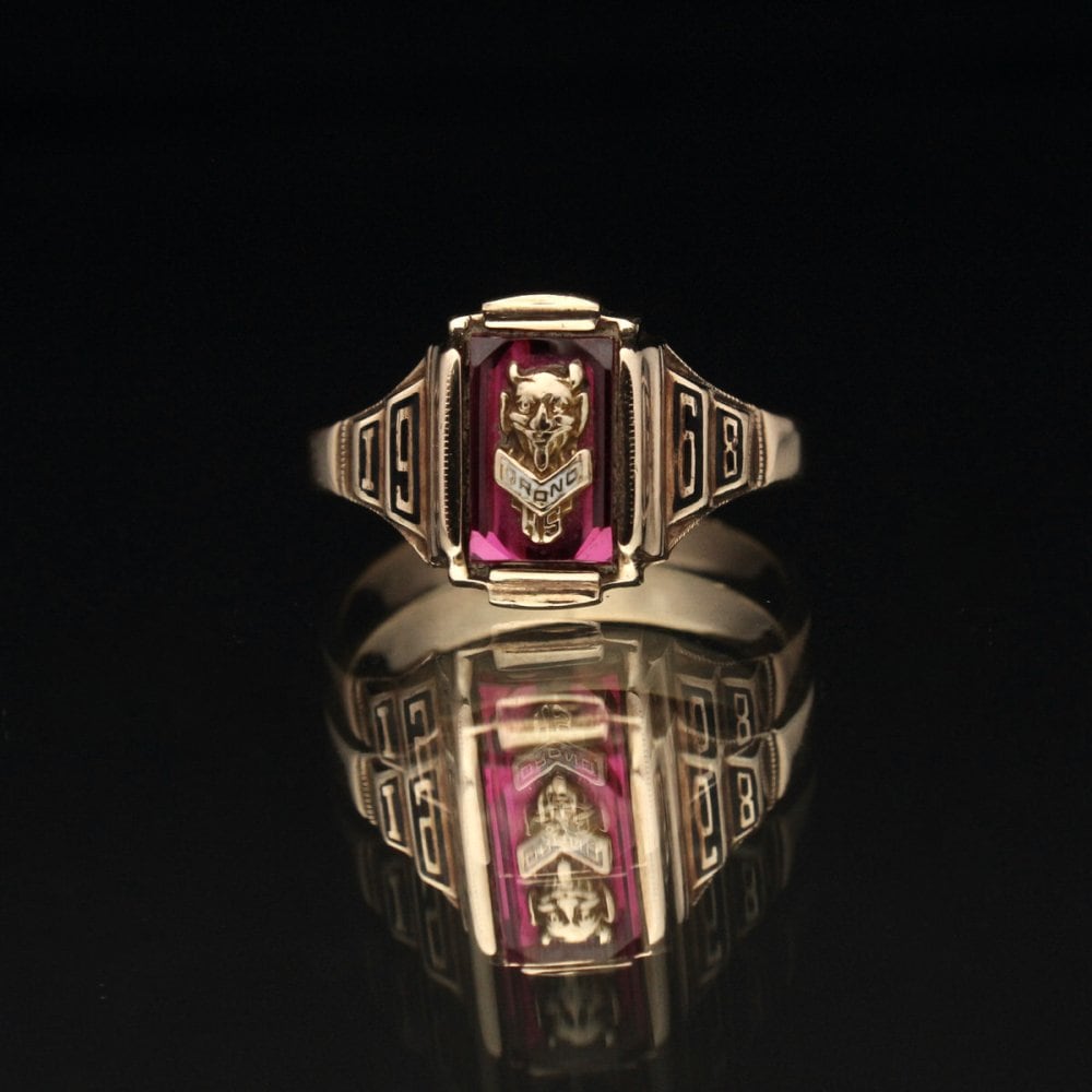 Vintage class ring from 1968. A rare type that uses a synthetic ruby, a team emblem instead of a school crest, in a small square structure that is typical of this era. The Satan (Devil) motif is an American design. Long-established Half Jones company, stamped with 10kt gold. Please check the condition in the photo and understand the characteristics of vintage before purchasing.