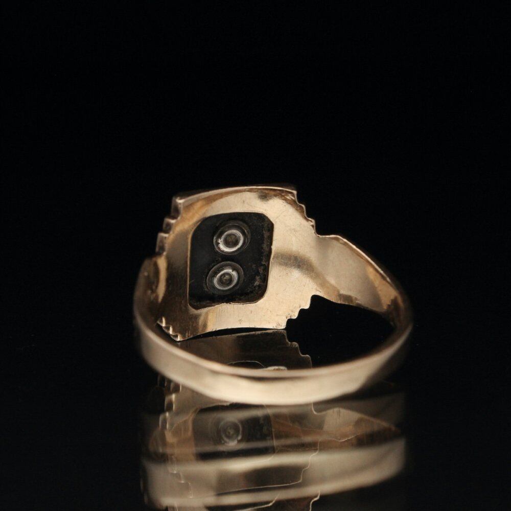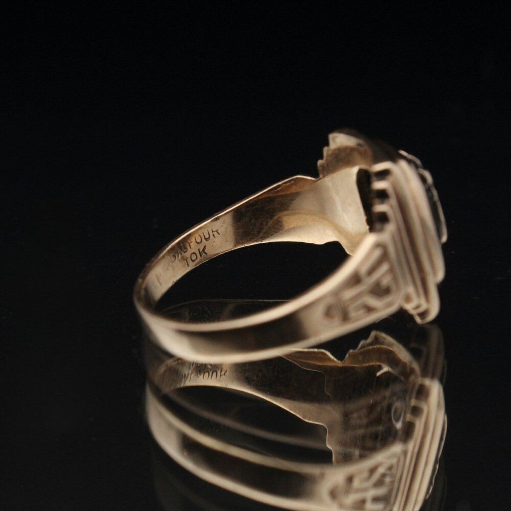 1942 vintage class ring. A popular and rare onyx top with a square design that is typical of this era. A simple silhouette and a slender body with an art deco style on the top are also elegant. The emblem is a scroll and possibly a quill motif, and is said to be a symbol of life and time. Engraved with 10kt gold from the long-established BALFOUR company. Please check the condition in the photo and understand the characteristics of vintage before purchasing.