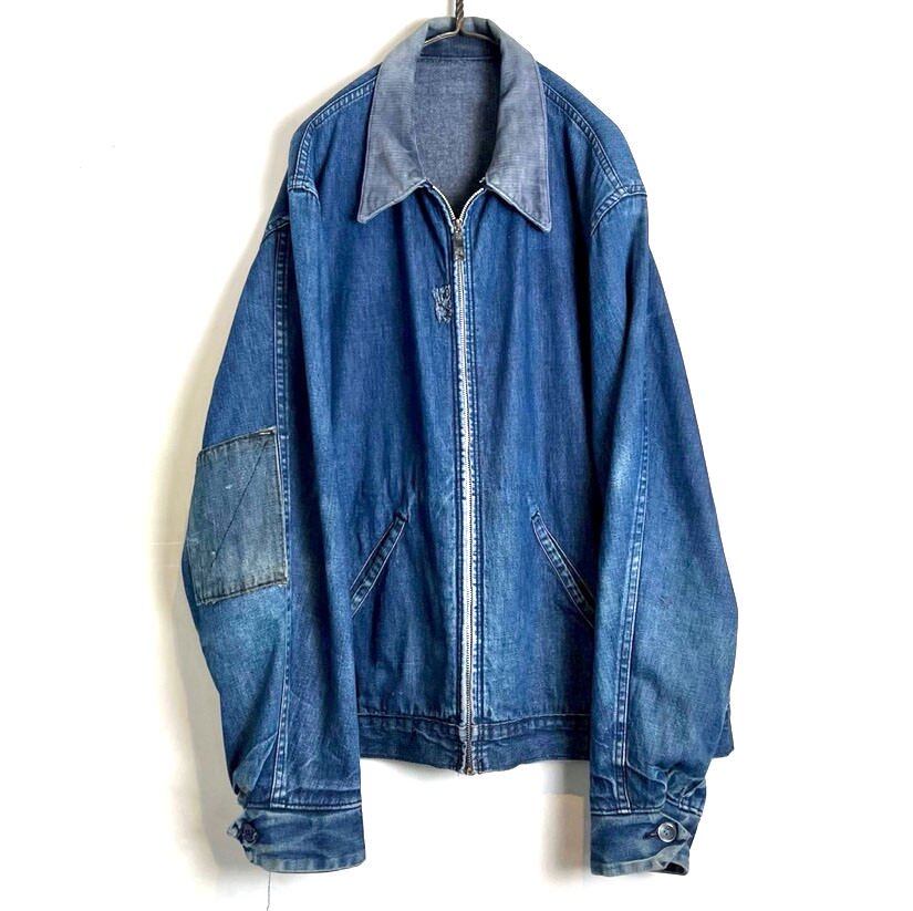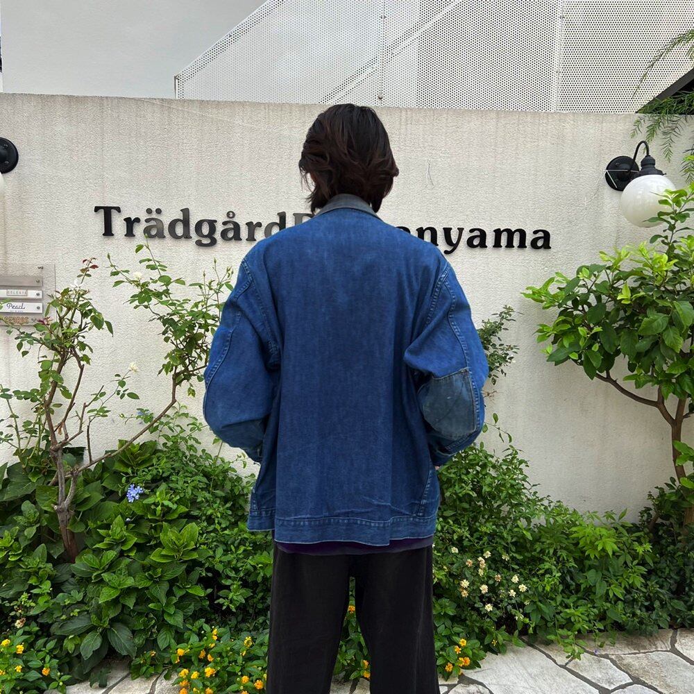 Denim jacket from the 70s The indigo color has faded with age. Denim from the 50s (think CARTERS overalls) is attached to the front and back with pockets. 1 piece A loose and masculine oversized silhouette, a drizzler type jacket that is easy to match