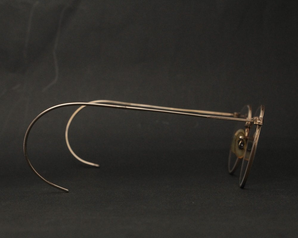 1940s vintage [American Optical] glasses. A full-view type Boston round frame with temples on the top, which was developed in the automobile society. Model Sampson is a robust type with a reinforced bridge. It is a round silhouette that looks more rounded with a very valuable 46 size. 12Kt- Yellow Gold gold-plated. New clear UV lenses are included. It has been appraised and maintained by an optician, and the size of the temple (or rope) can be adjusted. (At a nearby eyeglass shop) Although the condition has been carefully examined, there are scratches and scuffs as this is a vintage product. Please purchase after understanding the characteristics of vintage and antique. All of our eyeglasses are maintained and lens exchanged at g room, an eyewear store in Ebisu, Tokyo.
