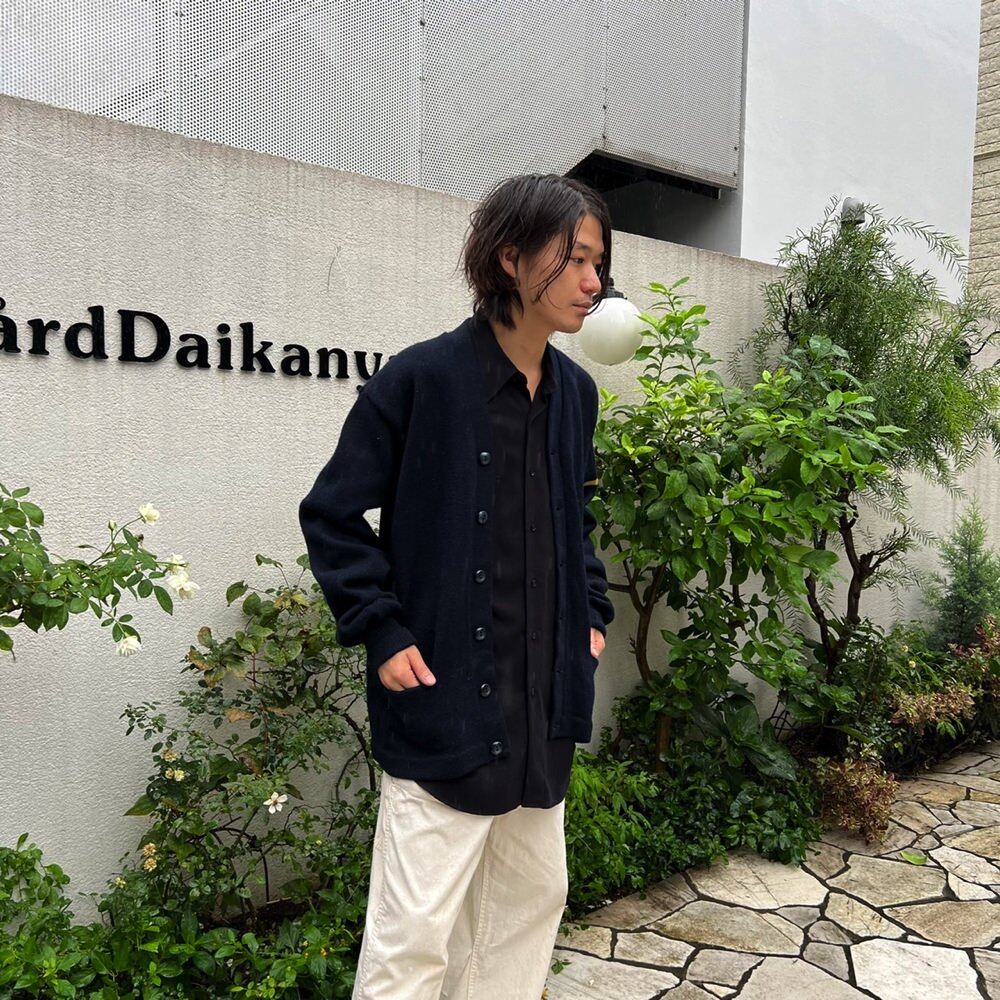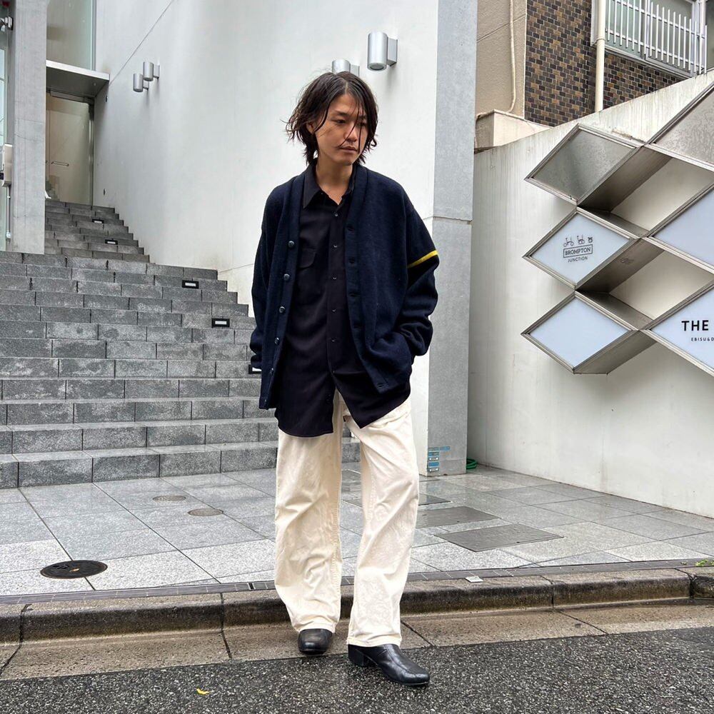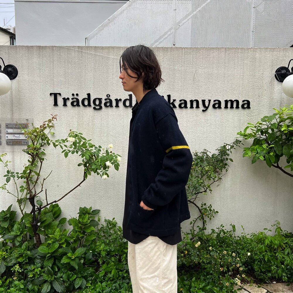 50s letter cardigan A simple design without embroidery or patches, a dark navy color close to black with a mustard yellow line on the left sleeve. A well-balanced silhouette with a sense of size.