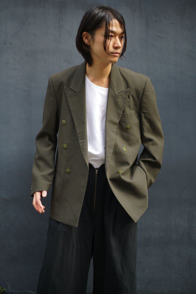 The double-breasted voluminous feel is elegant, and the low gorge line makes it look more casual and light.