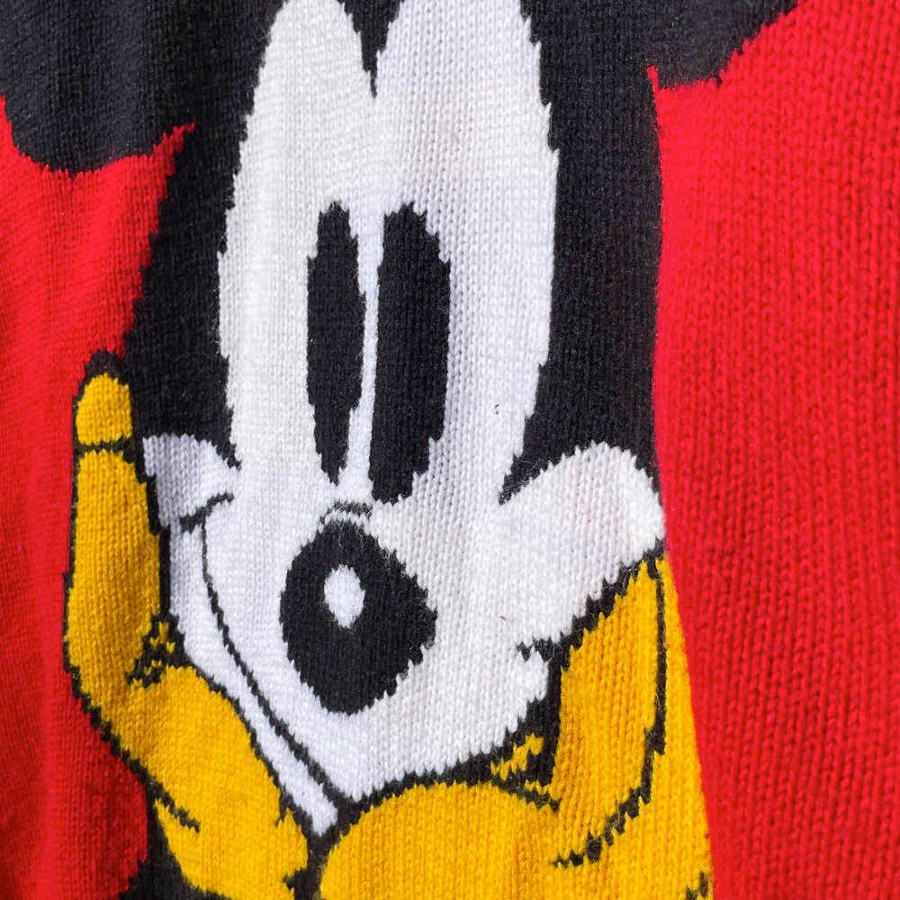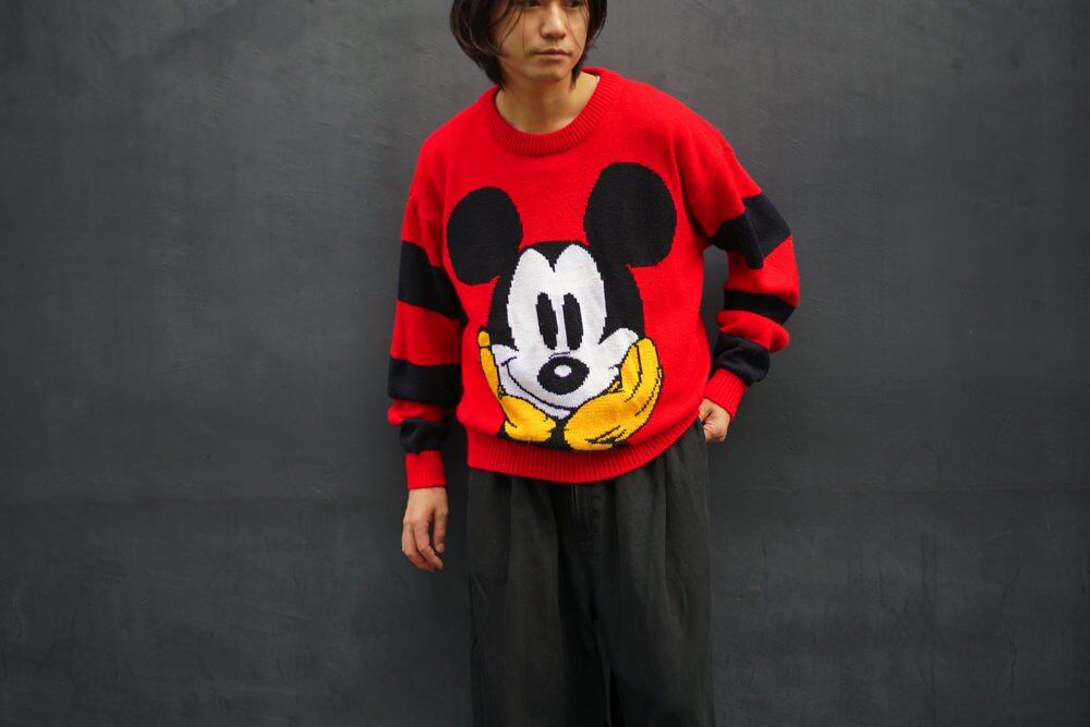 A cute outfit with a large Mickey on the front and a retro design with a border pattern on the sleeves.
