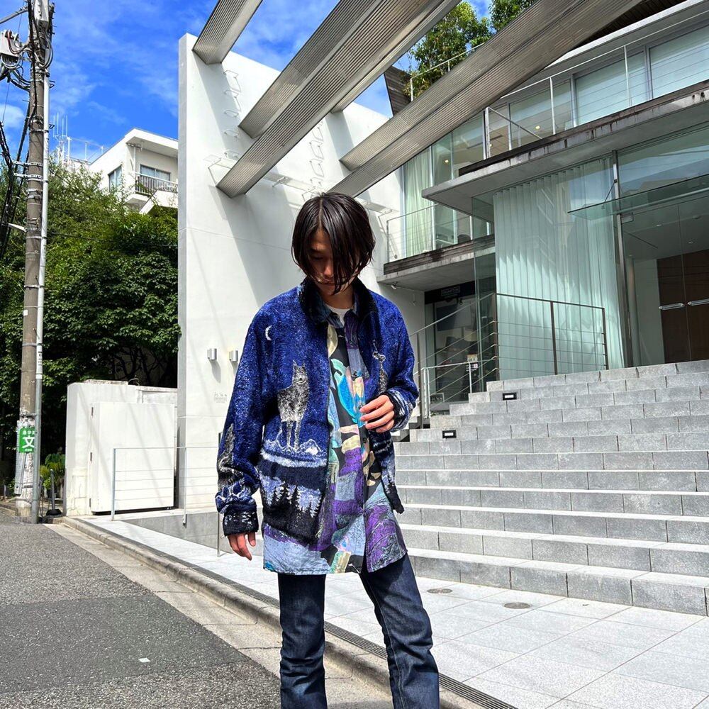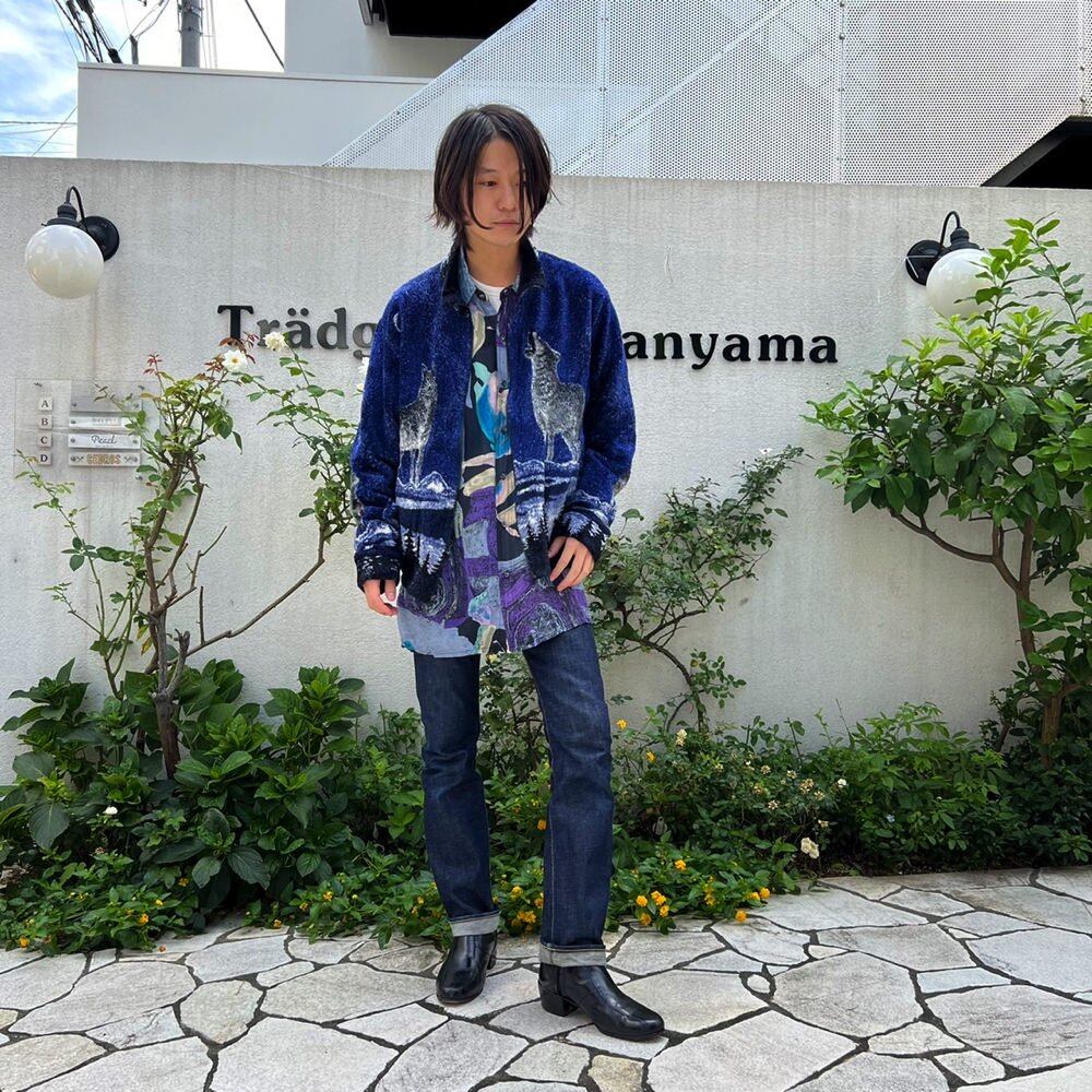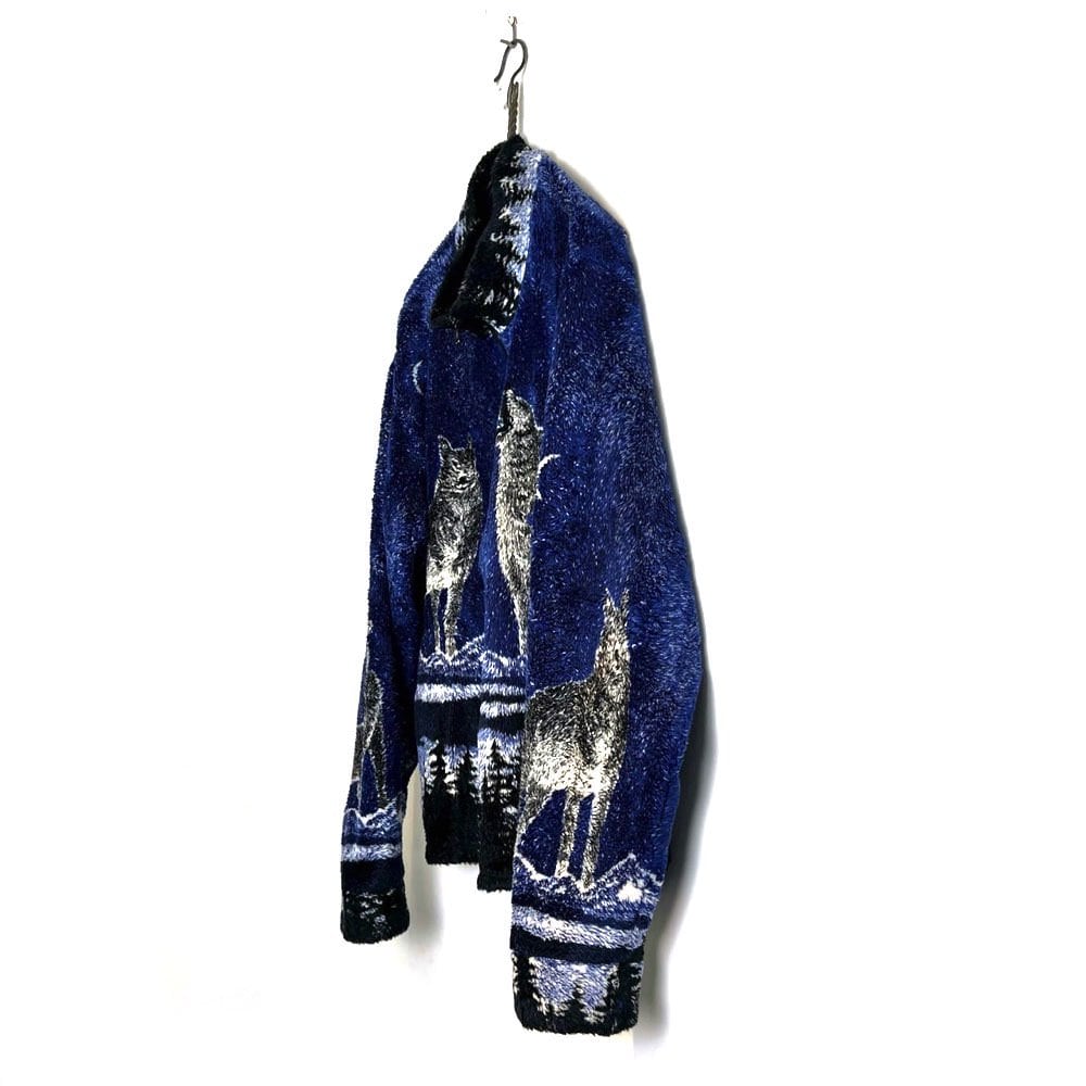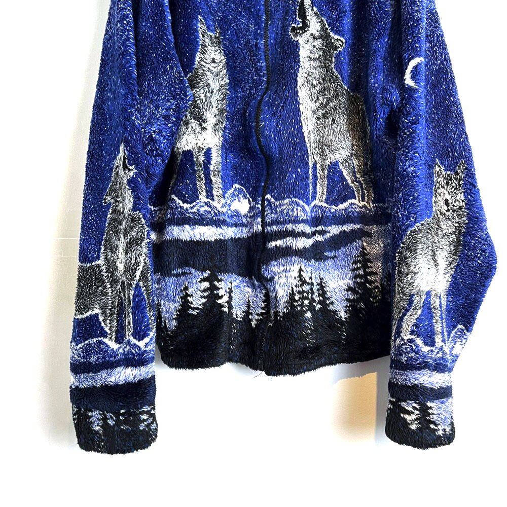 90s fleece jacket A romantic and moody piece with a pattern of wolves howling in the moonlight. Soft and light 100% polyester fleece fabric. A feeling of size with a space moderately without being too much