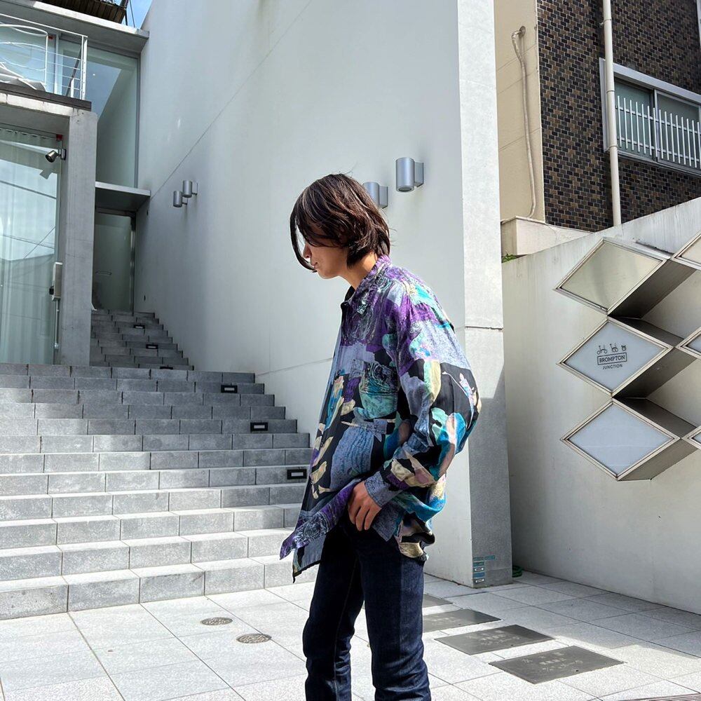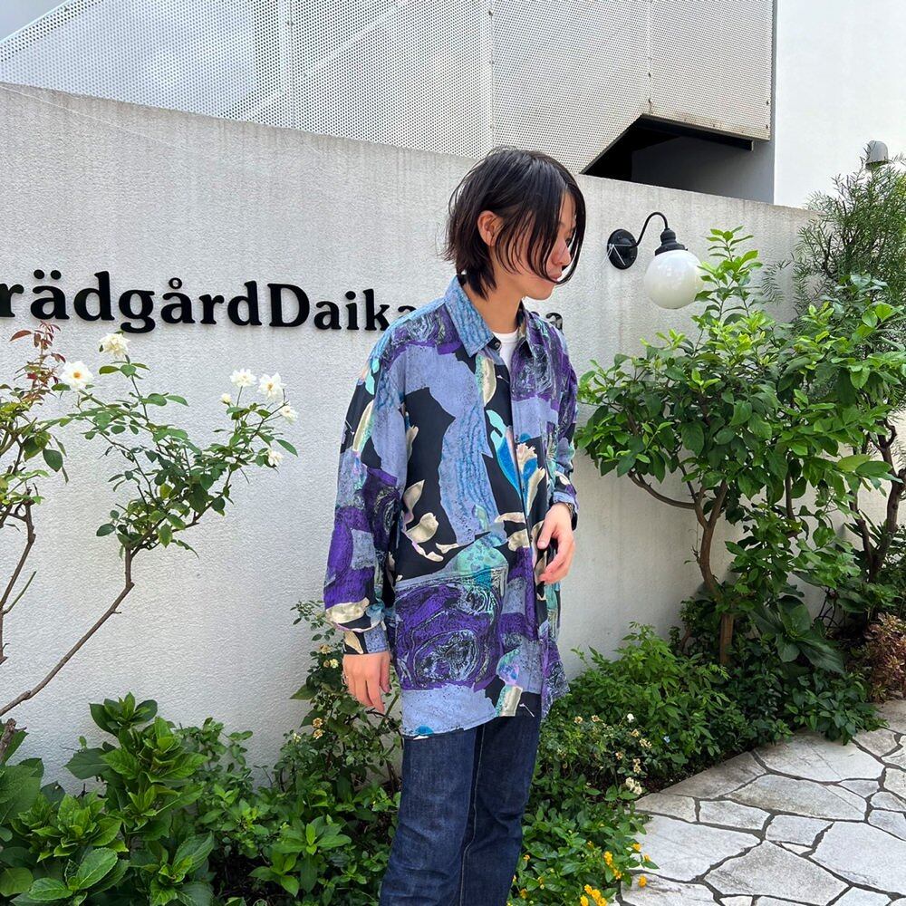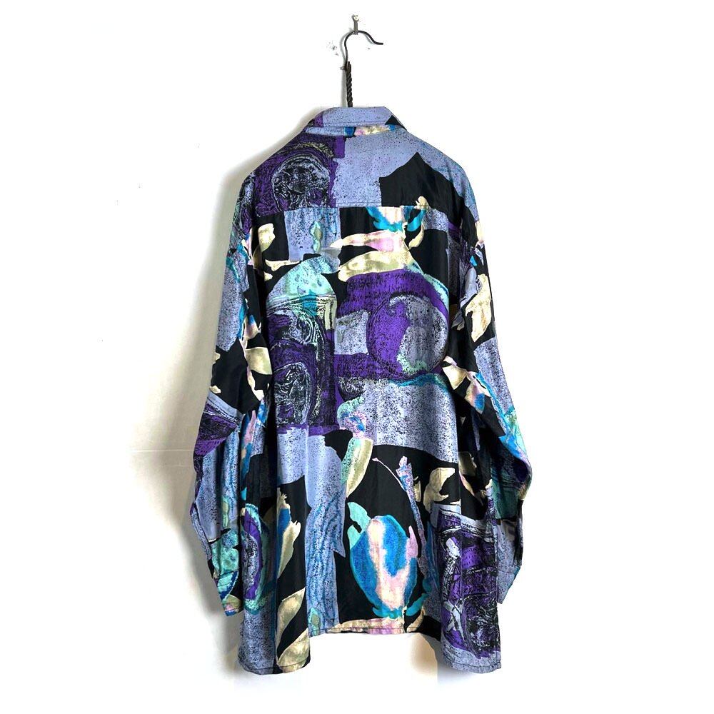 Silk shirt from the 80s Abstract botanical art with purple, gray and black colors are also good.