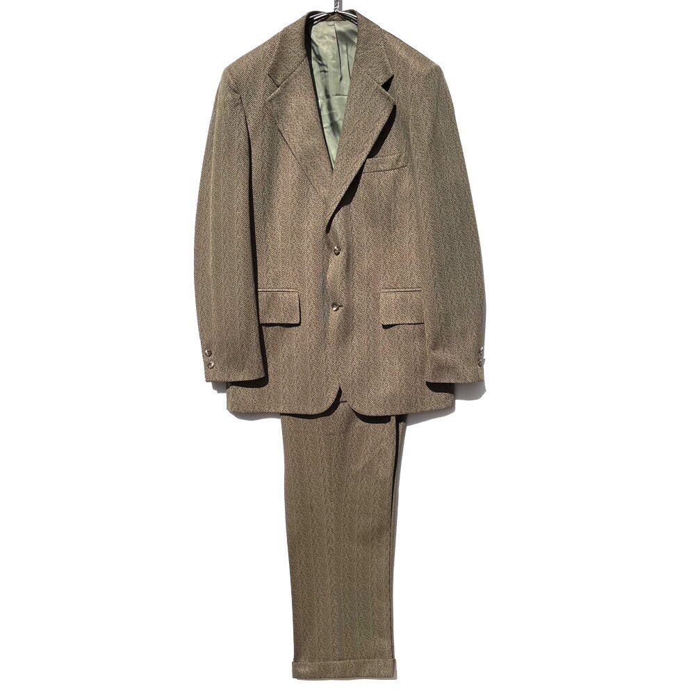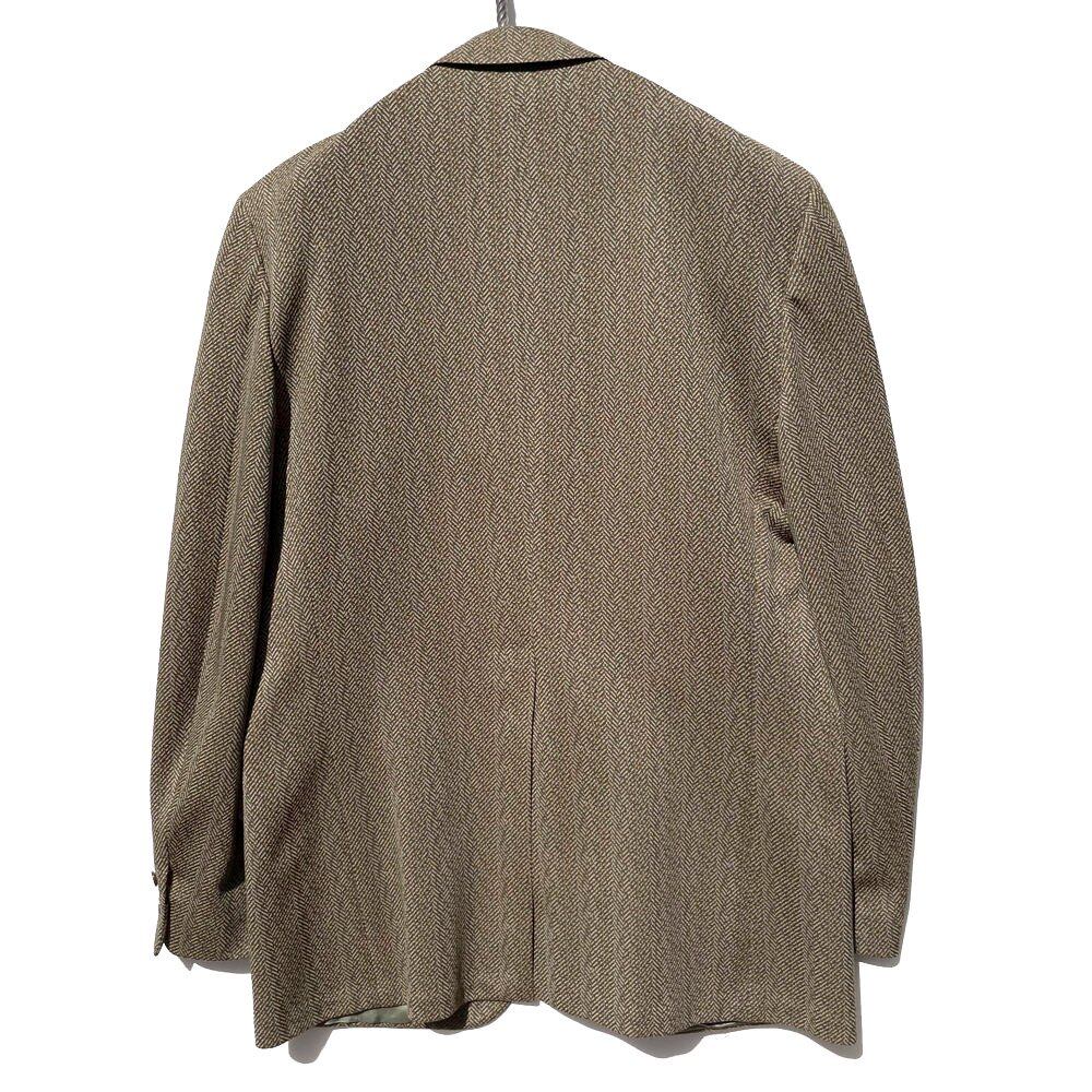 The jacket has a vertical box silhouette with two buttons and a deep center vent.