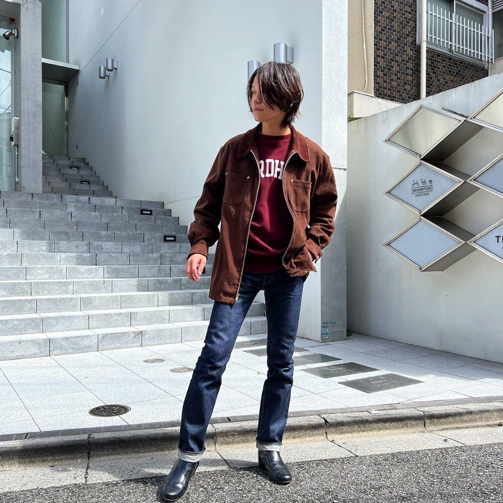 Peach skin shirt from the 90s Smooth brushed peach skin cross collar with corduroy fabric for a masculine look reminiscent of a hunting jacket. A piece that is soft and comfortable to wear