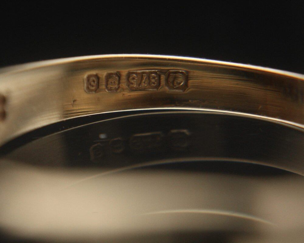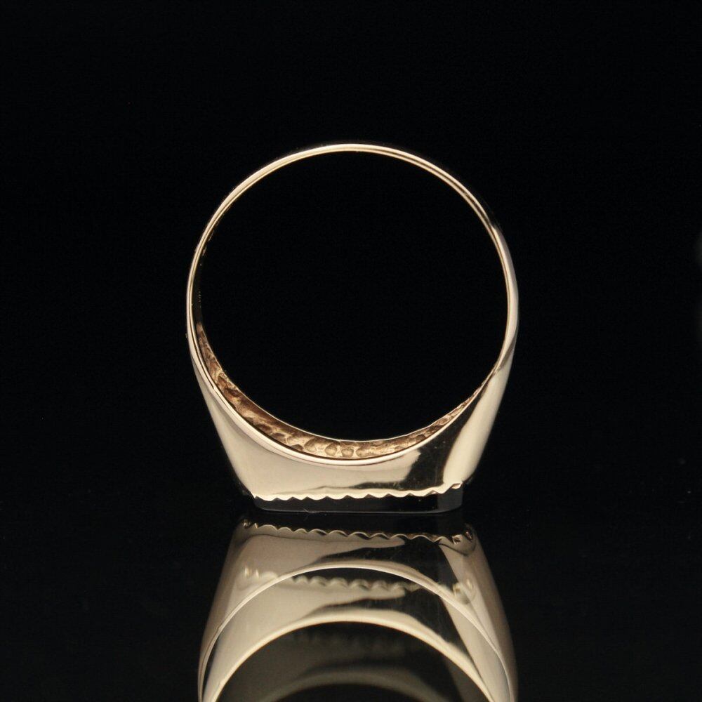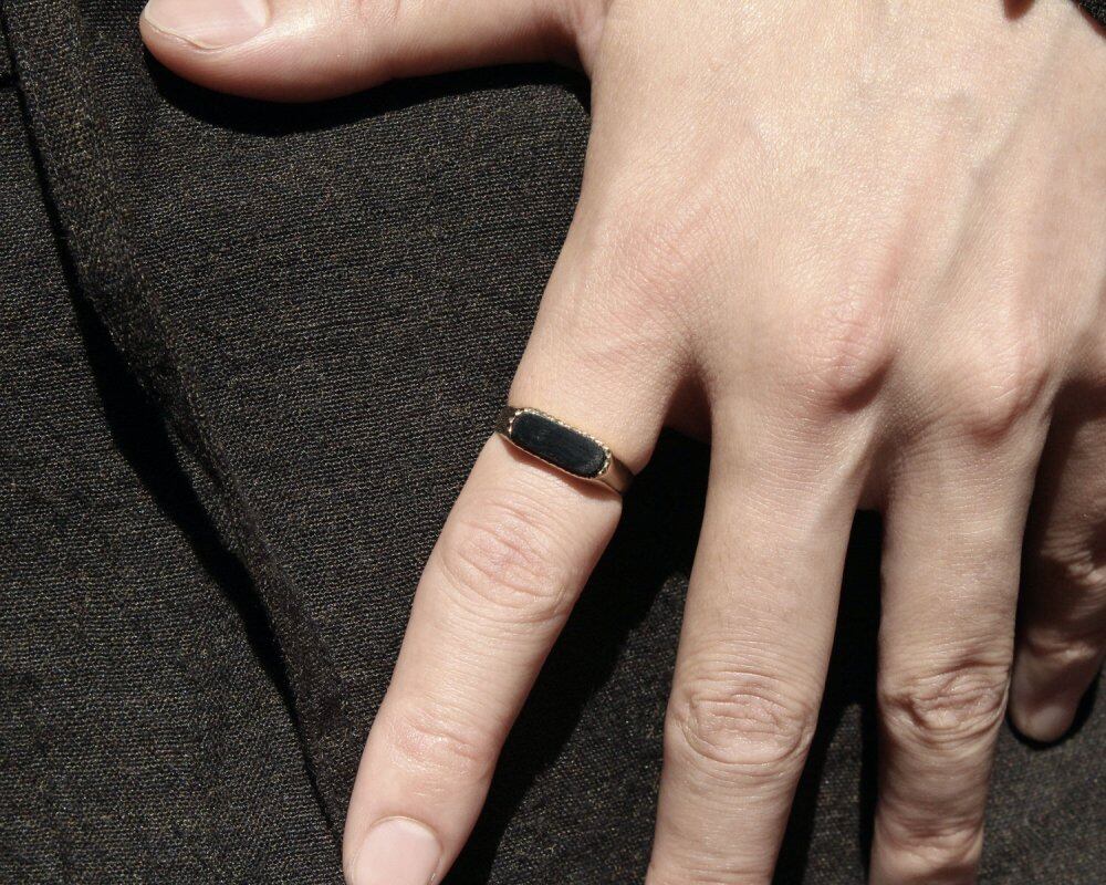 British signet ring. It is the only ring that is allowed to be worn by British gentlemen who wear good things that can be used for a long time without waste as much as possible. The top design with onyx on a narrow rectangular silhouette gives it an elegant look. Among the rings of this design, it is relatively large and has a strong presence. It is a ring with a minimal impression that is hard to find if you look for it. Both the onyx and the hoop body have been polished from the beginning and are in a very beautiful state. Hallmarked in 375-9ct gold, 1979 London office. Please check the condition in the photo and understand the characteristics of vintage before purchasing.
