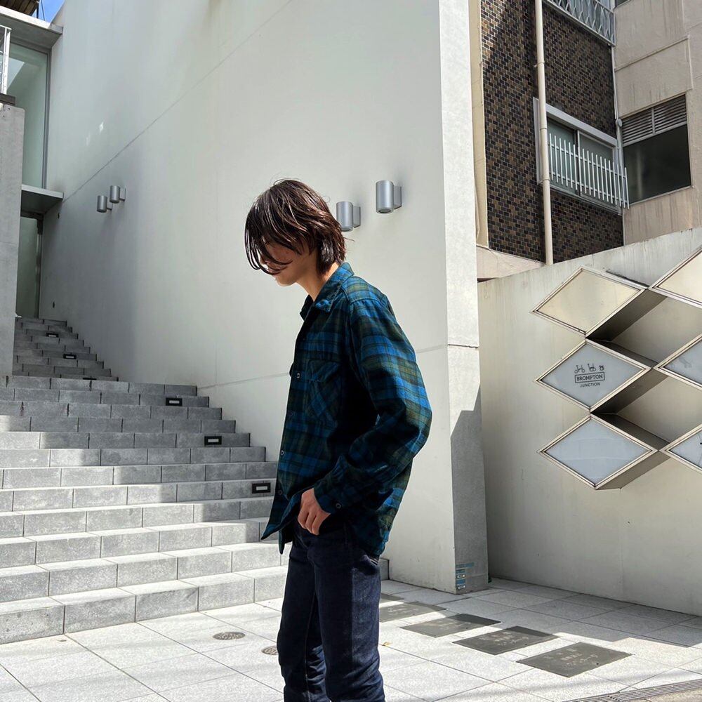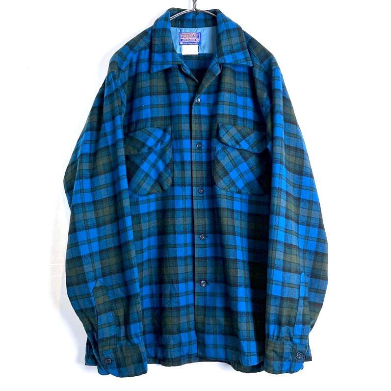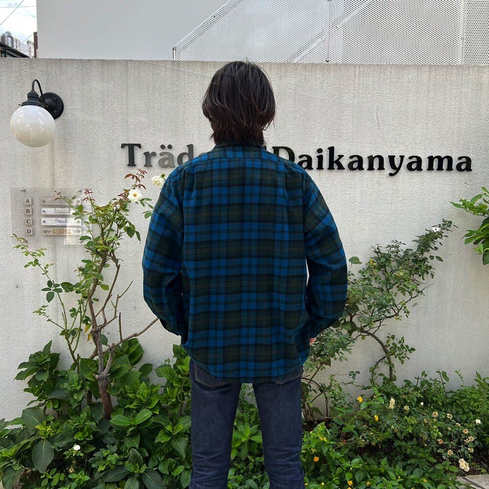 70s wool shirt blue, black, and olive cold colors. Easy to match with check.