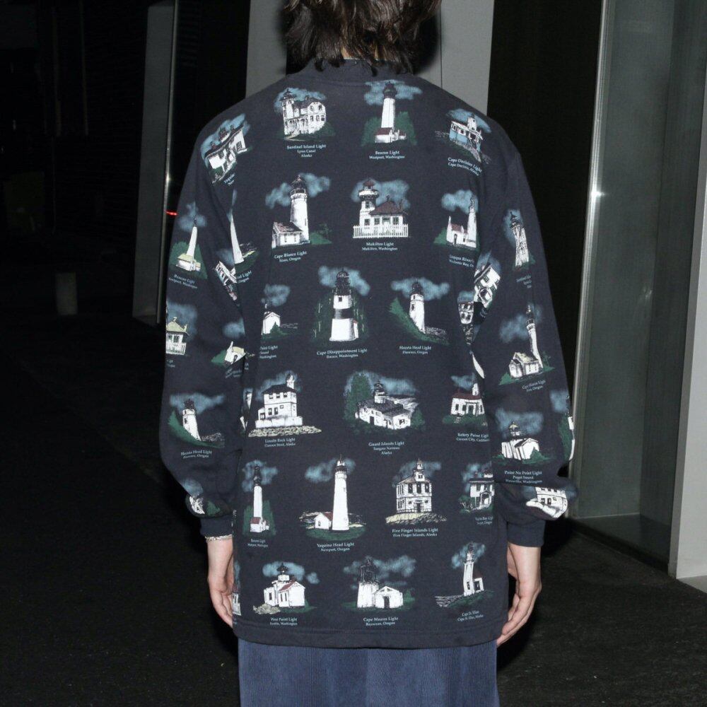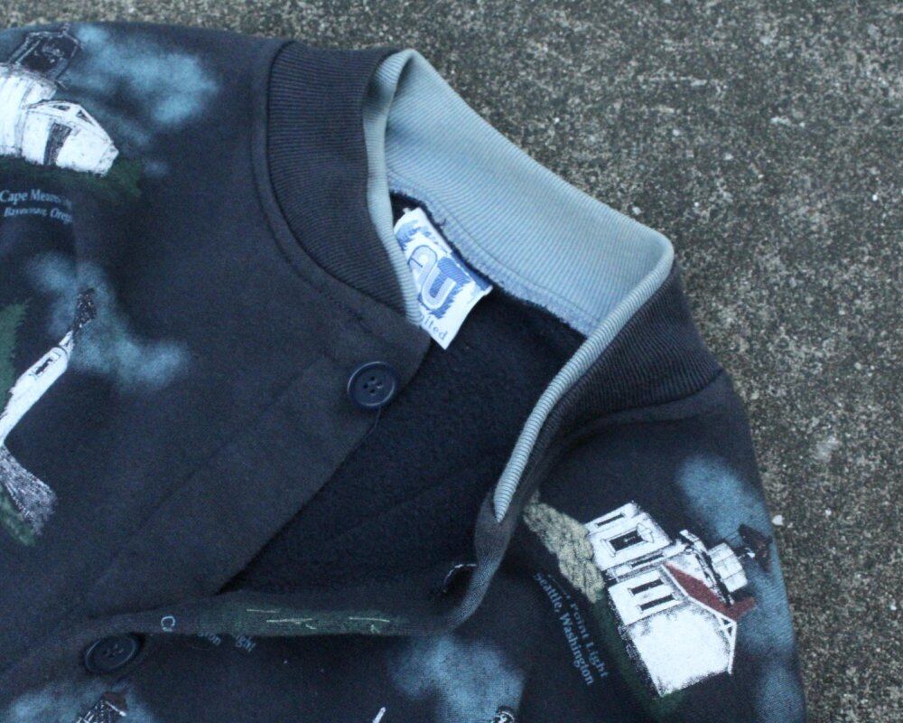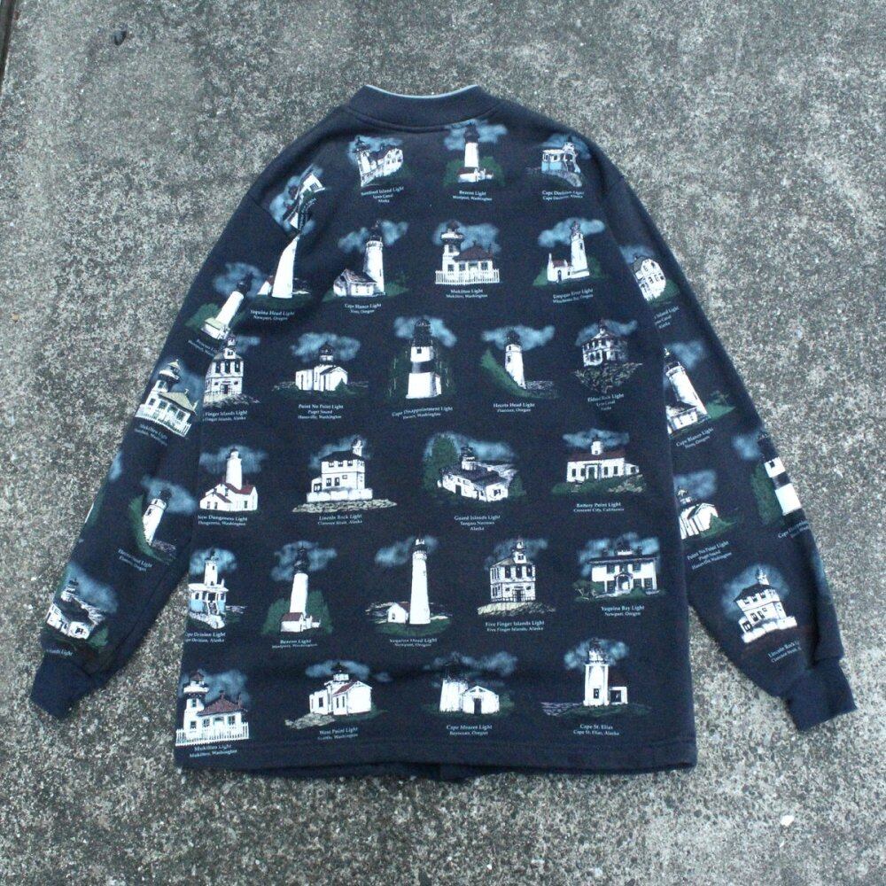 1980s sweat cardigan. A classic design with a print of Americas major lighthouses on dark navy fabric. A neat vertical silhouette with just the right amount of room. The double collar at the neck is the point, and the fabric is soft and has a sense of security. Relaxed silhouette. Quality: Cotton/Polyester Color: Dark Navy SIZE: L [Size] Shoulder Width: 52cm Width: 58cm Sleeve Length: 66cm Length: 76cm [Model Size] Height: 175cm Shoulder Width: 43cm B (Chest): 85cm W (Waist): 71cm Old Since it is a thing, there is rarely aged deterioration. Although we try to make the product photos as close to the actual color as possible, the color of the actual product may differ depending on your monitor settings, room lighting, etc. Please check the photos and understand the vintage characteristics before purchasing. ※Please refer to here for the measuring method.