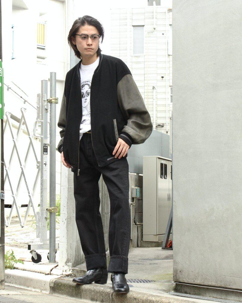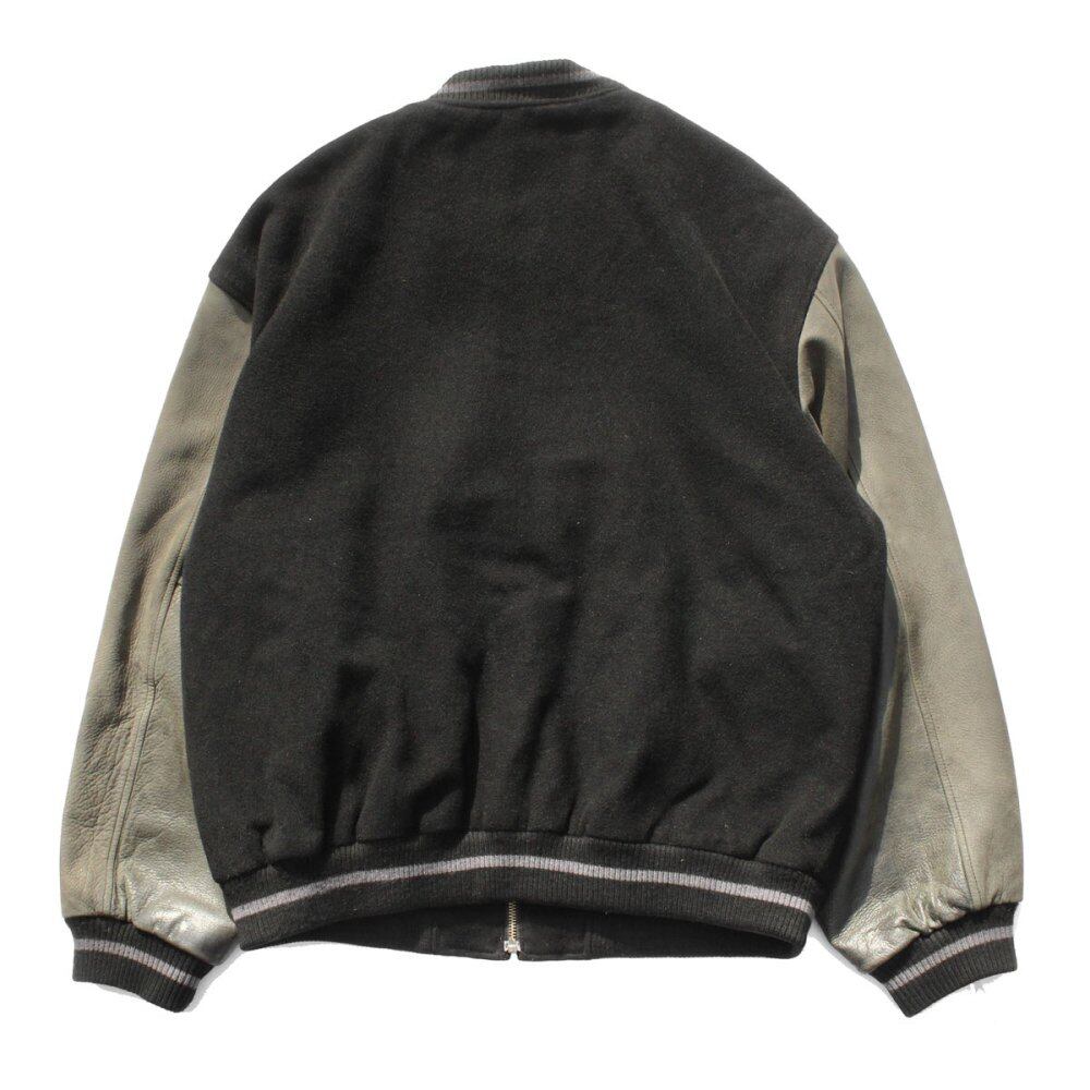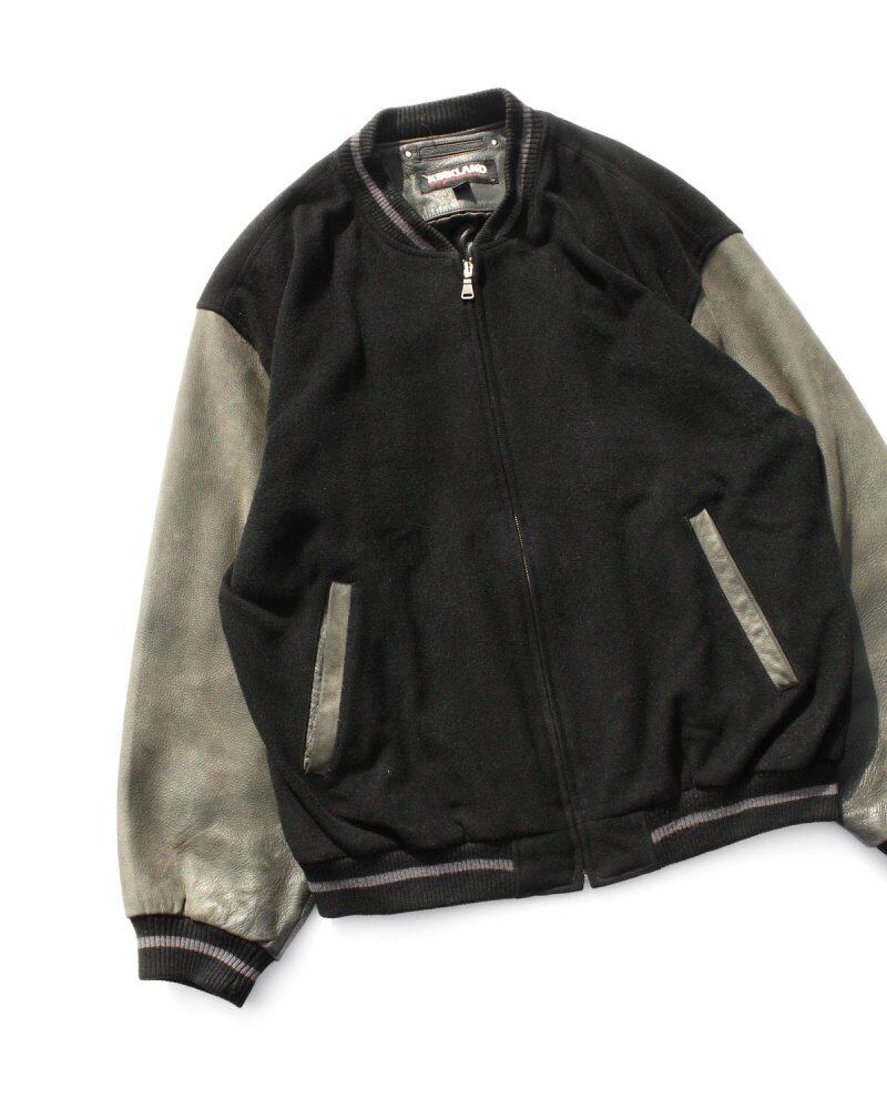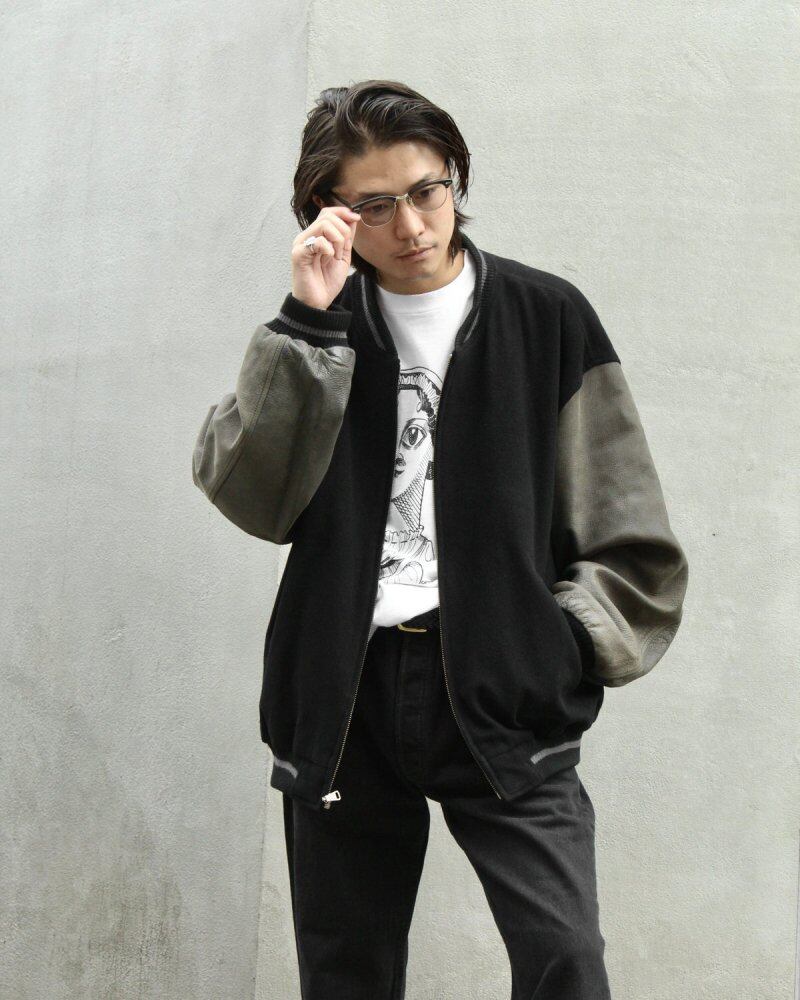 An award jacket style blouson from the 1990s. Made by KIRKLAND, which can be seen in second-hand leather jackets, it was probably sold as fashion wear, and its well-balanced silhouette and simple design are attractive. The combination of black felt wool and gray leather gives it a minimalistic appearance. Since it is old, there is rare deterioration over time. Please check the photos and be aware of the vintage characteristics before purchasing.