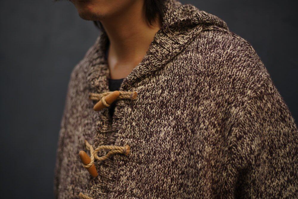 The point is the hoodie type, which is rare in knitwear, and the toggle button with a crude impression.