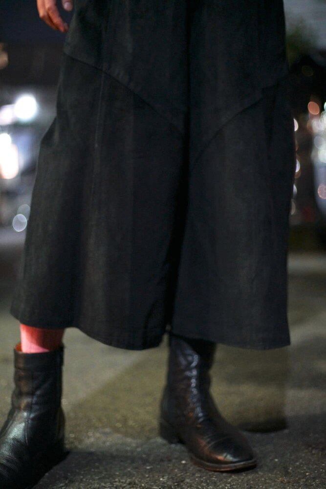 The versatile all-black coloring, the wide silhouette like a hakama, and the avant-garde design of the odd length are impressive.