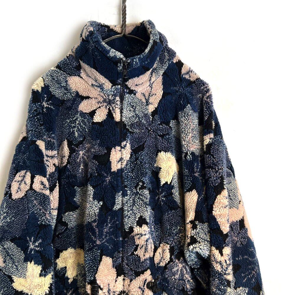 90s fleece jacket The deep navy color with pale pink and off-white maple leaf patterns gives it a nice atmosphere. Vintage fleece jacket with a somewhat Japanese feel. A jacket-like outerwear that is comfortable to wear