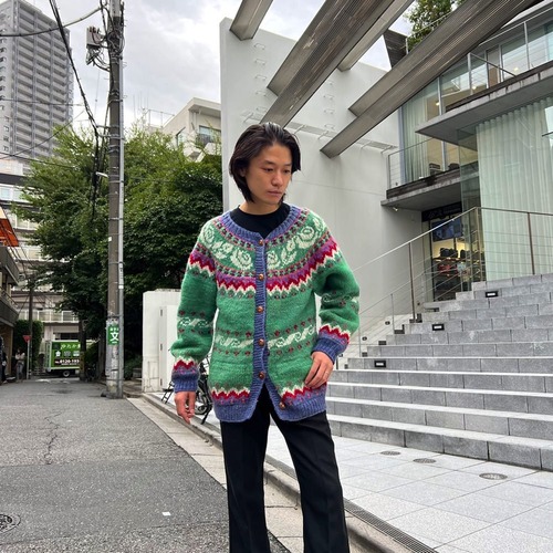 Nordic cardigan from the 70s Pale green with pale lavender color and cute rose knit pattern Hand-knitted vintage cardigan Comes with hand pockets and is easy to use.