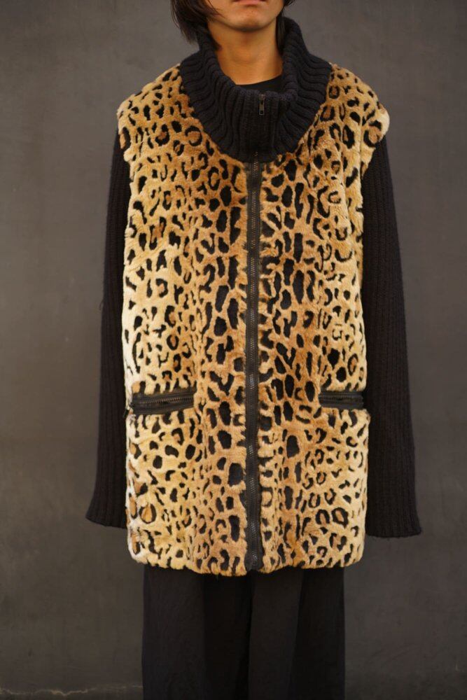 A zip-up jacket with a combination of leopard pattern fake fur and knit.
