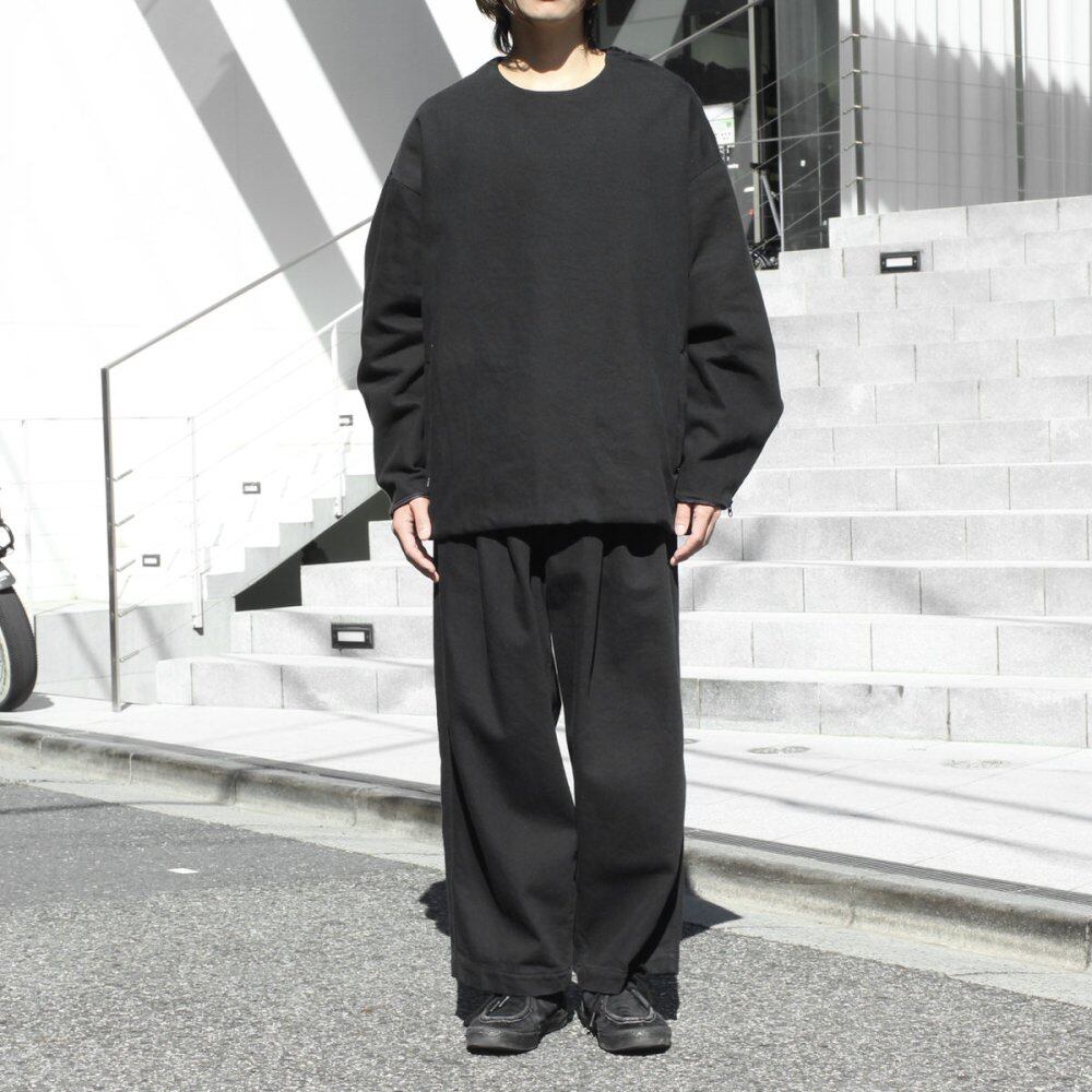 [roundabout] 2022 A/W 2 tuck trousers with a wide silhouette that has room around the waist that this brand has been developing since its establishment. This time, it is made with the trousers of the 1950s in mind, and the cotton drill fabric with a heavy texture is used to create a more mannish and elegant item. A solid black color with a natural texture that gives a sense of depth. You can also wear it with a pullover made of the same fabric.