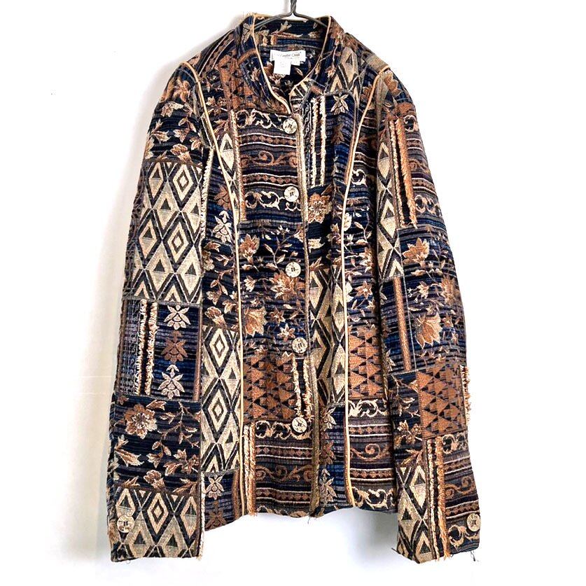 80s gobelin jacket Brown, beige, black, blue, botanical batik pattern in a nice atmosphere gives it a luxurious feel. Not too big, just the right amount of room, and a vintage gobelin jacket with a nice silhouette.