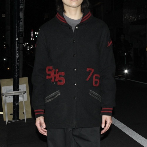 Award jacket from the 1970s. The name in Japan is Stadium Jumper, but in the United States it is also called Varsity / Lettermans. The practice of wearing emblems (letter) is said to have started at Harvard University and is still awarded to players with excellent results and is adopted by strong schools. This is a Pharaoh jacket type vertical silhouette with a clean silhouette on the right front. It is a rude impression that the patch shines on the all-black wool fabric. Quality : Wool Color : Black SIZE : 36 [Size] Shoulder Width: 48cm Width: 55cm Sleeve Length: 61cm Length: 74cm [Model Size] Height: 175cm Shoulder Width: 43cm B (Chest): 85cm W (Waist): 71cm Old and rare There is aged deterioration etc. Although we try to make the product photos as close to the actual color as possible, the color of the actual product may differ depending on your monitor settings, room lighting, etc. Please check the photos and understand the vintage characteristics before purchasing. ※Please refer to here for the measuring method.