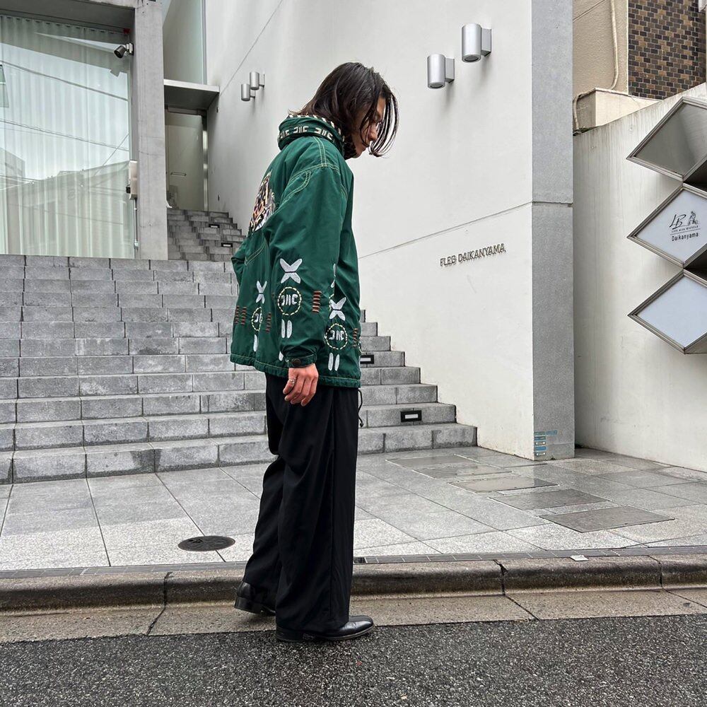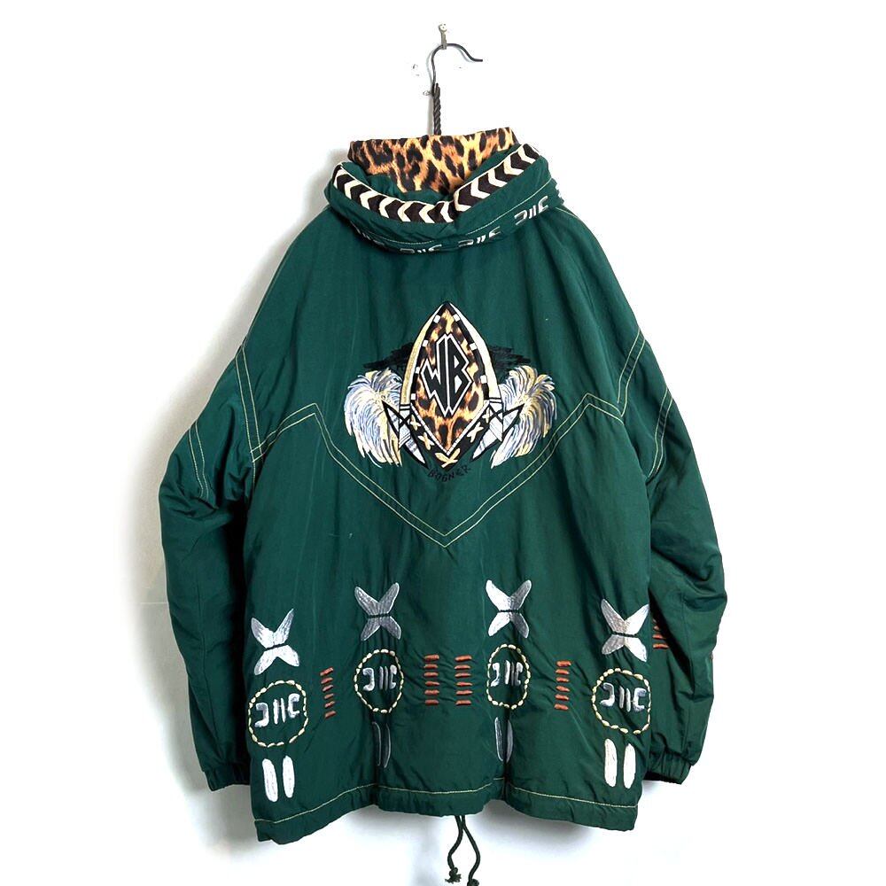 80s nylon anorak A brightly colored green color with a V-zone leopard switch and embroidered on the body and sleeves. Size, good silhouette one piece