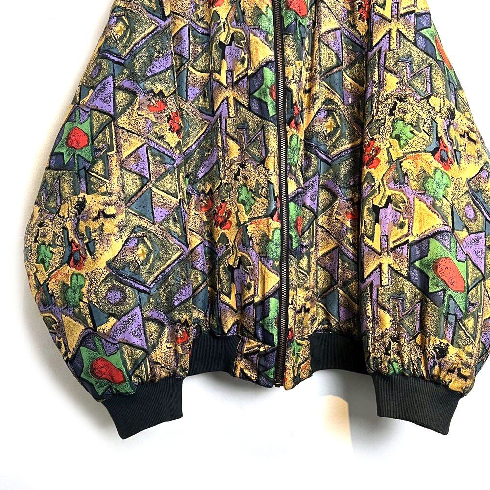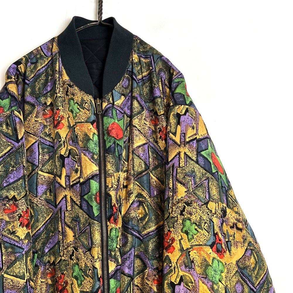 A reversible silk jacket from the 80s with an impactful abstract art side and a simple all black quilted side.