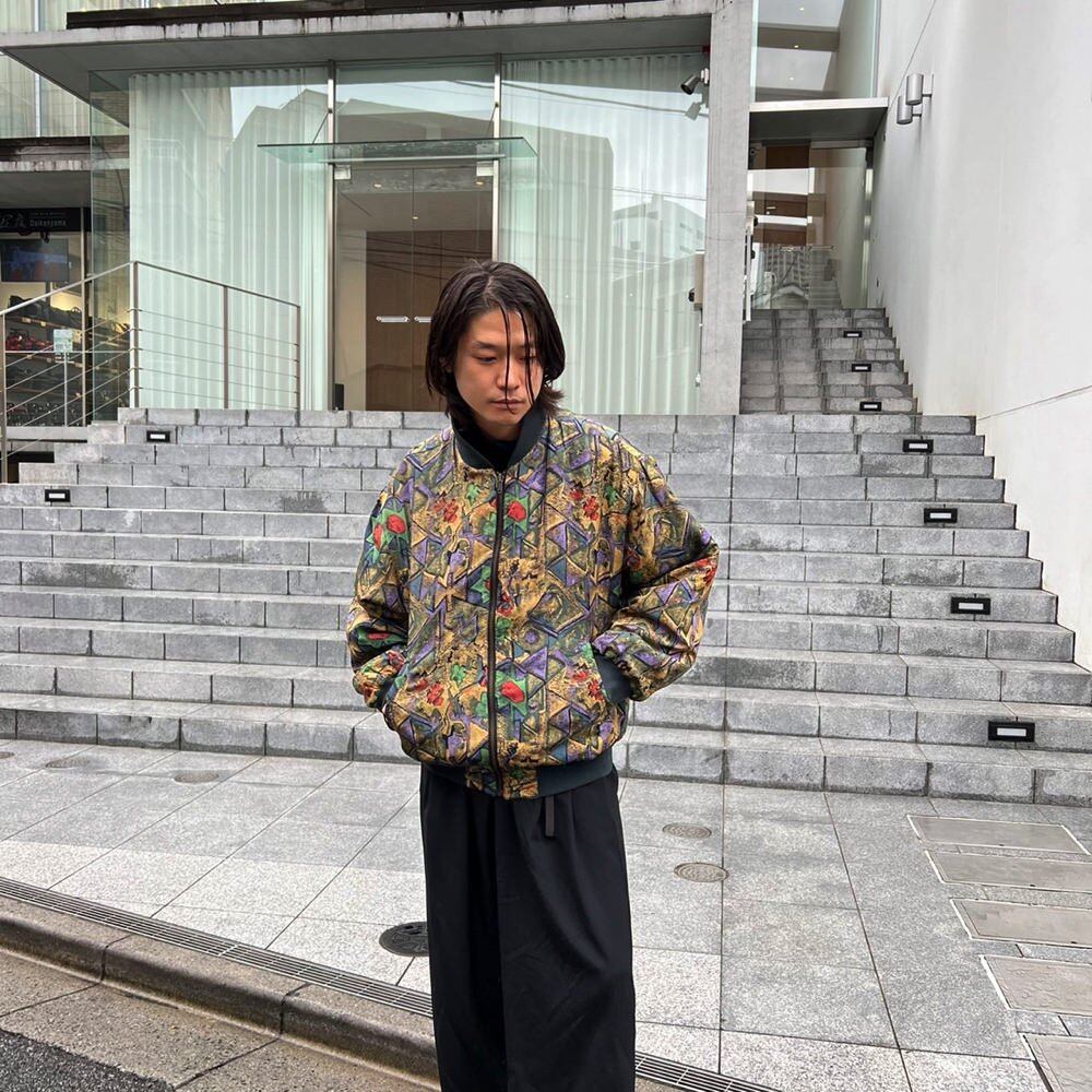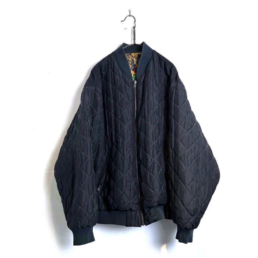 A reversible silk jacket from the 80s with an impactful abstract art side and a simple all black quilted side.