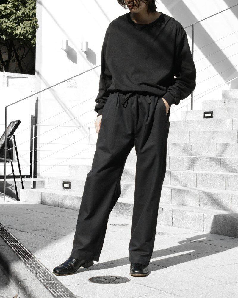 [ALVISTA] Sleeping pants made simply using the brands archive stock fabric. Easy pants with elastic shirring and drawcord waist. The tapered silhouette has just the right amount of room for the entire wearer, and the versatile FREE size setting makes it very easy to wear regardless of the wearers body shape or style. Made of soft cotton twill fabric that has just the right amount of firmness like work pants. It has a unique and elegant texture with the use of overlapping black and navy threads.