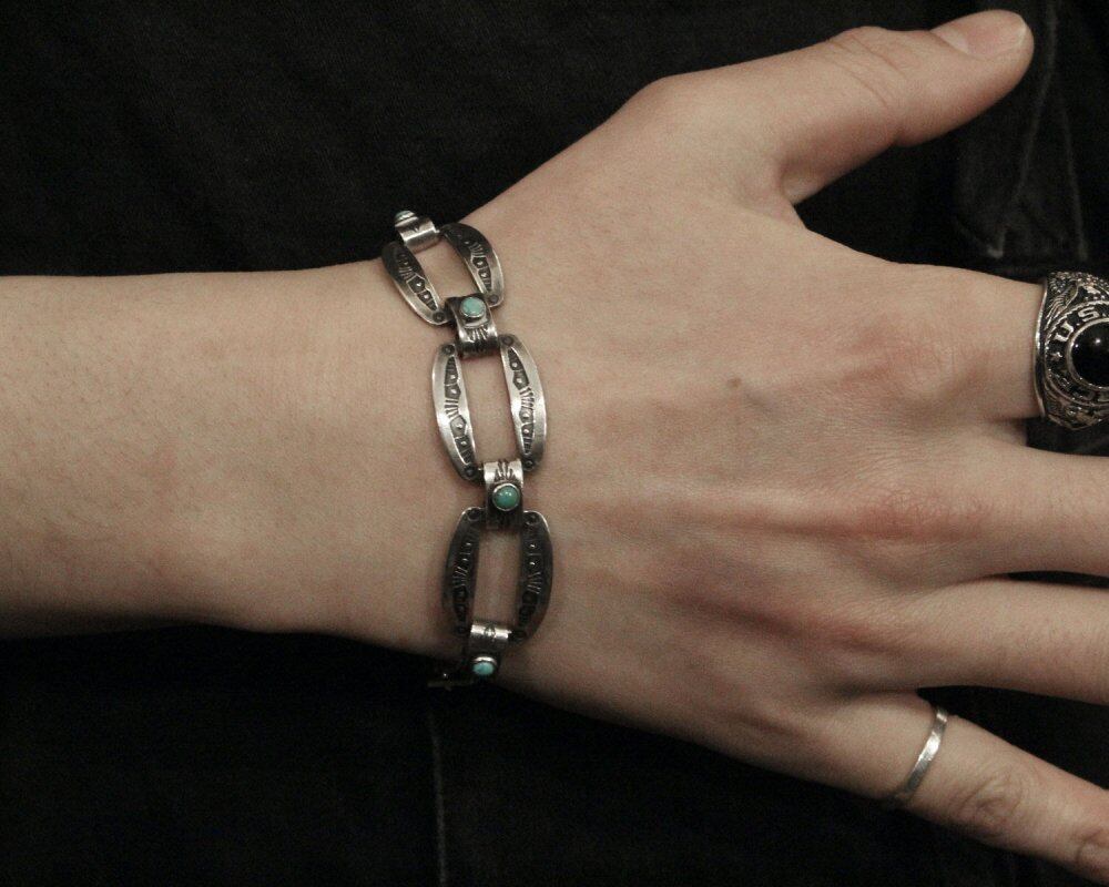 Southwestern Native American Jewelry. The stampwork and small turquoise accents give it a vintage look. Its not stamped, but its probably sterling silver. [Size] Width: 16mm Inner circumference (end to end): 185mm Since it is an old item, it rarely deteriorates over time. Although we try to make the product photos as close to the actual color as possible, the color of the actual product may differ depending on your monitor settings, room lighting, etc. Please check the photos and understand the vintage characteristics before purchasing. ※Please refer to here for the measuring method.