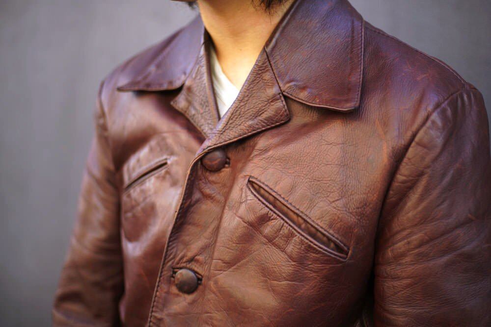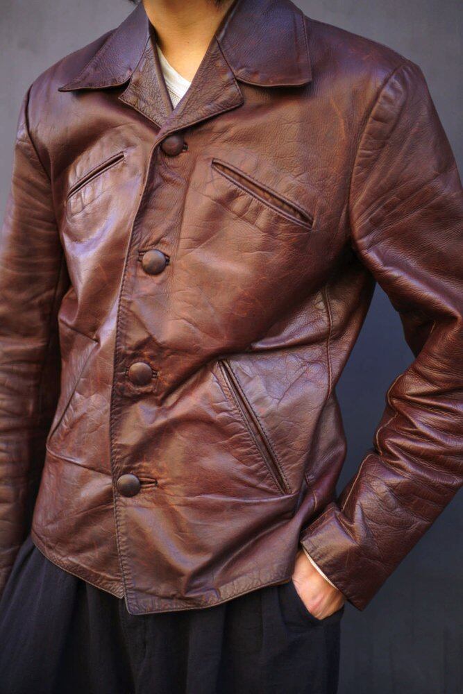 Around the 1970s, it is a leather jacket made by GLASS WATER.