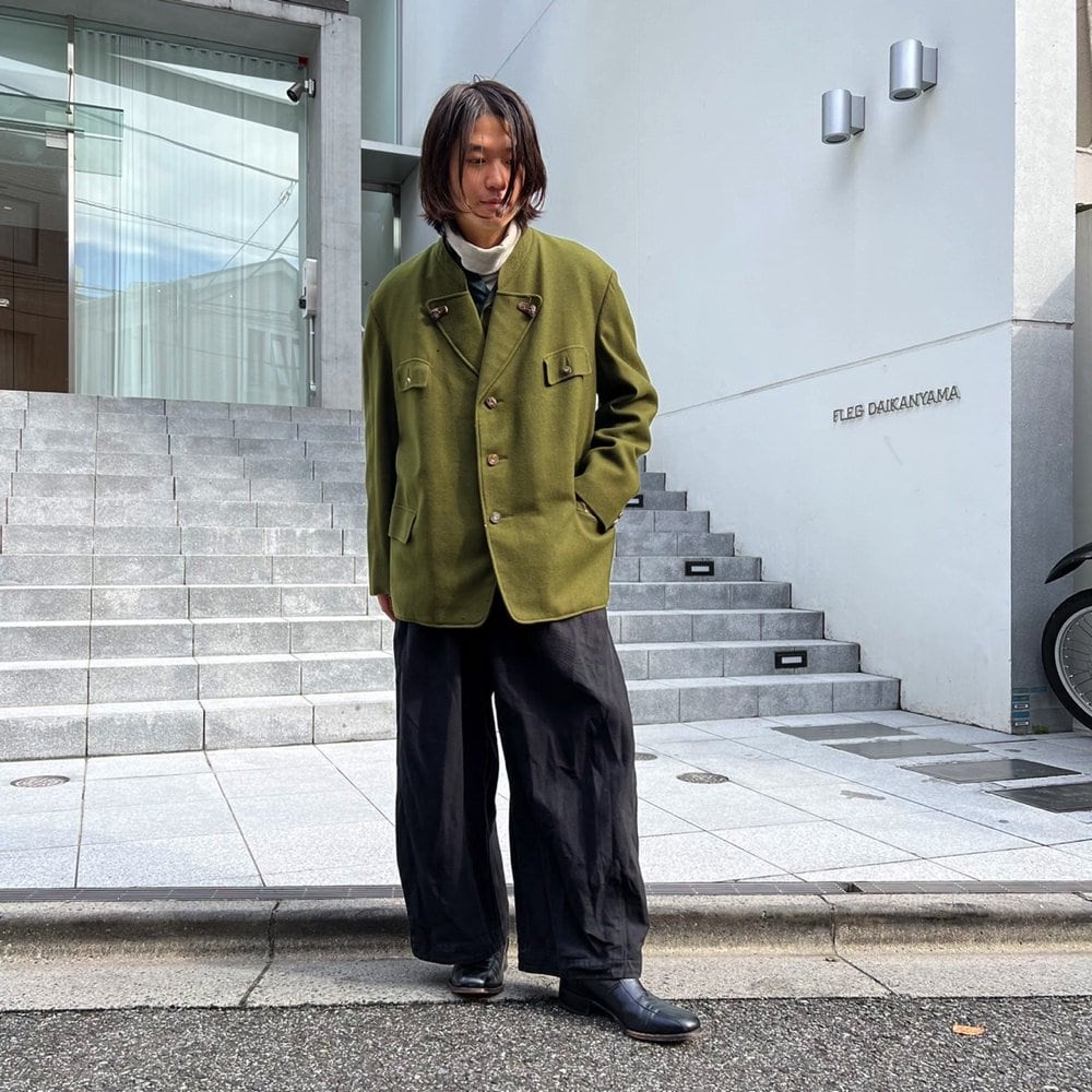 Tyrolean jacket made in Austria in the 1960s A vintage jacket made of smooth and soft textured wool fabric, military-like olive color, and deer antler buttons for a tasteful look. sense of size