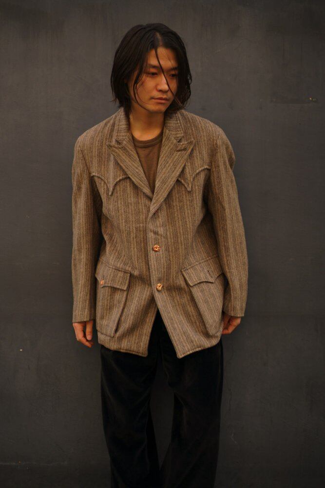 An elegant lapel design with a peak lapel, a casual design with gusseted pockets and a western yoke that makes it easy to put on.
