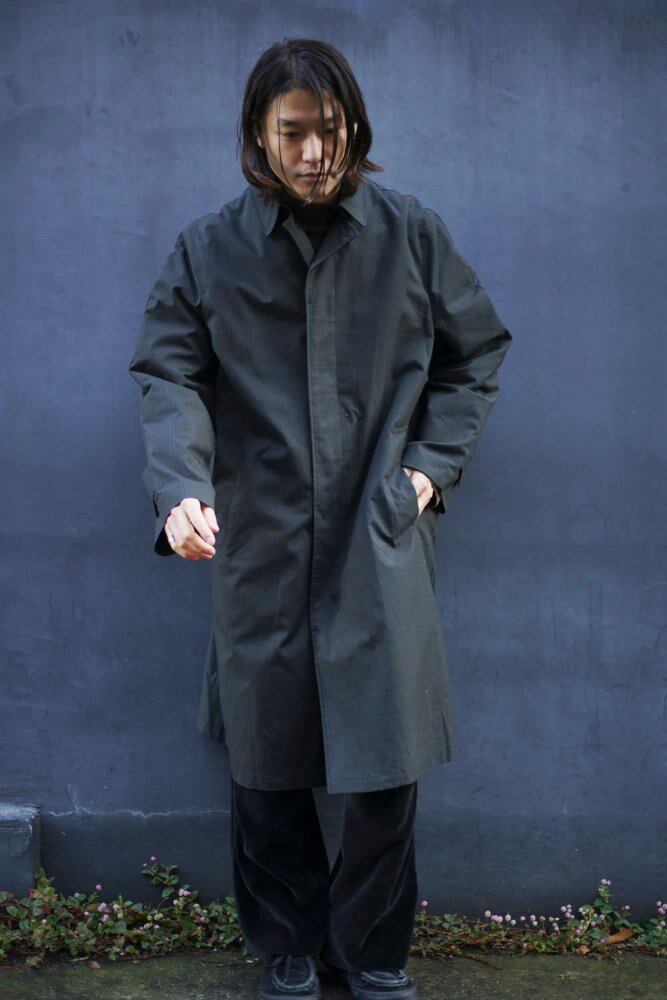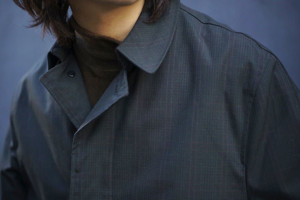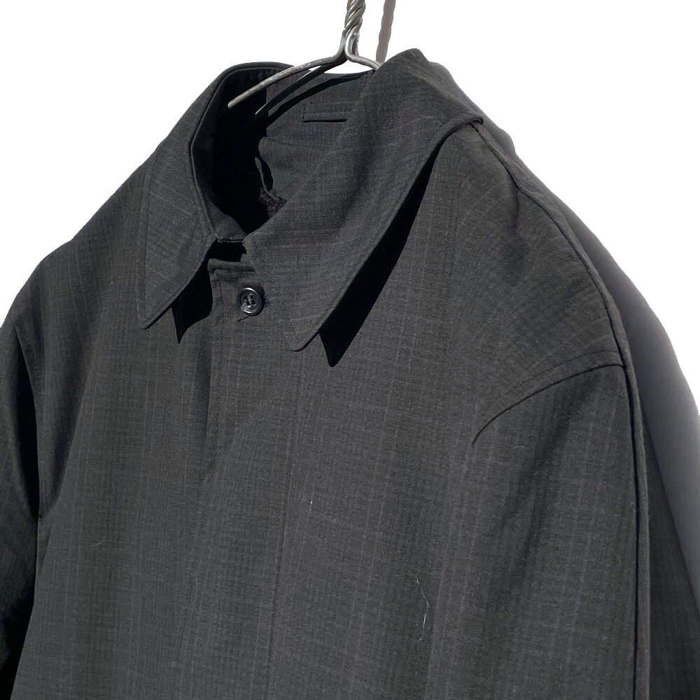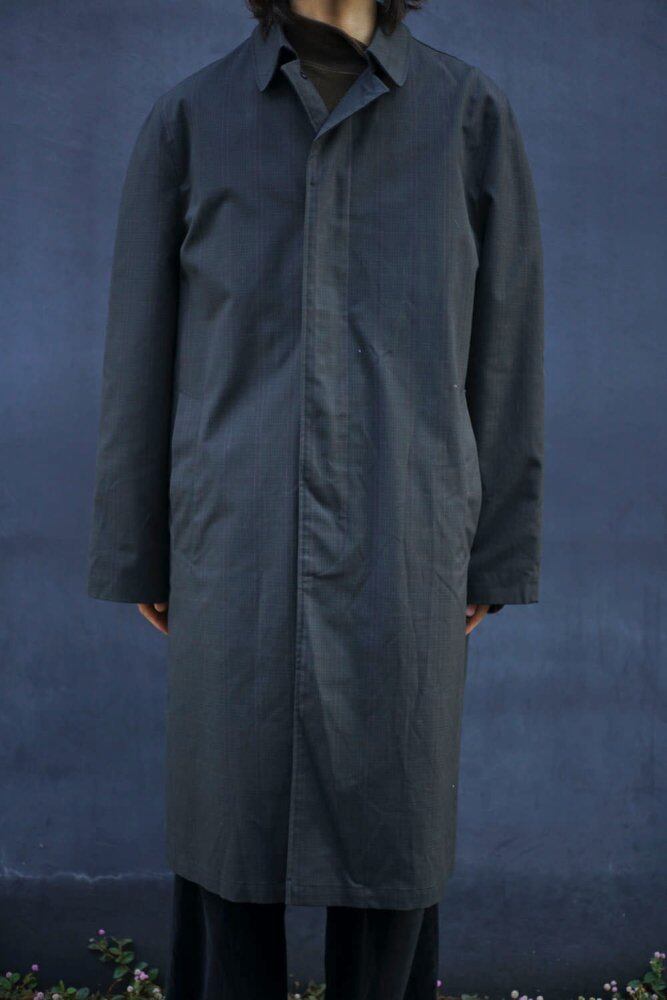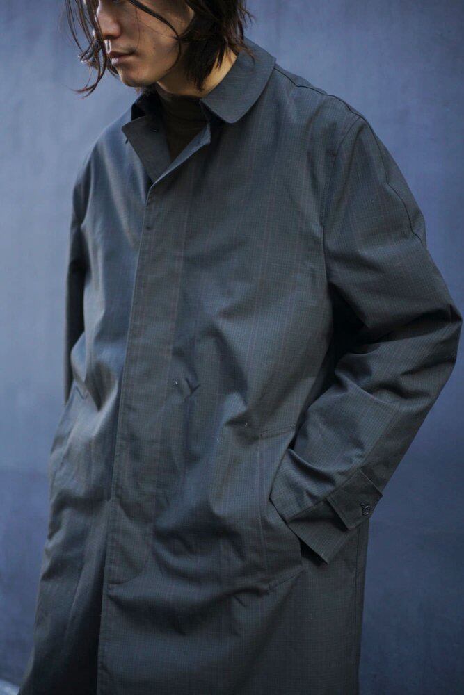 Around the 1960s, this is a vintage stainless steel collar coat made by BRENT. An elegant fabric with a faint charcoal gray and glen check is used, and it looks sexy with a dull luster.