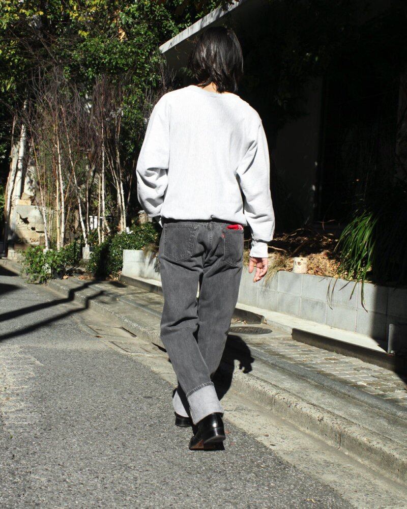 1992 Levis 501 yarn-dyed denim. The flat color fading and the gray color on the back give a minimalistic impression that is unique to yarn dyeing. The long length is also designed to show the goodness of the yarn dyeing by widening the cuff width. In recent years, the price of this item has skyrocketed due to the small number of individuals.