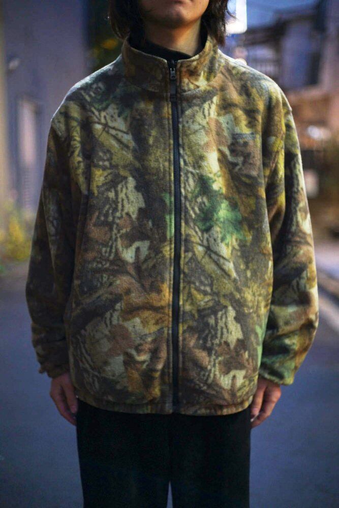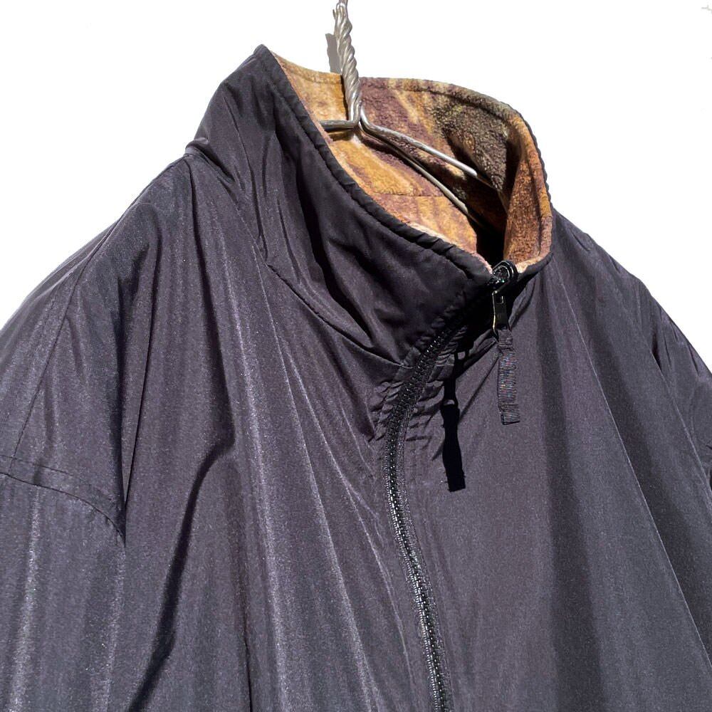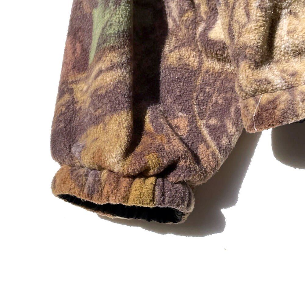 Reversible design with fleece side with soft camouflage pattern and black body with smooth texture.