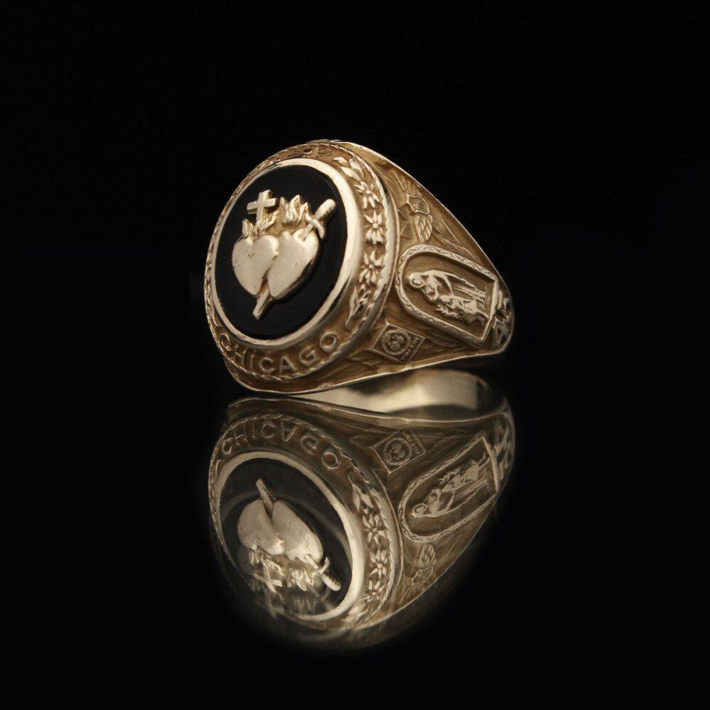 Vintage class ring from 1945. A very rare design with a heart motif top in a round onyx top. The Sacred Heart symbol, which represents Jesus and Mary and is also a symbol of love, is probably a class ring from a Catholic university in Chicago (from a design point of view). Originally a rare onyx and round silhouette, the side design is also deviating from the design point of view, with saints and other Latin symbols engraved, and the delicate metal engraving reminiscent of a vintage Tiffany class ring gives it an elegant look. . It is still in good condition, including onyx, considering its age. Unusual hallmarks of S and Arrow probably made by a local jeweler of the time, stamped with 10kt gold. Please check the condition in the photo and understand the characteristics of vintage before purchasing.