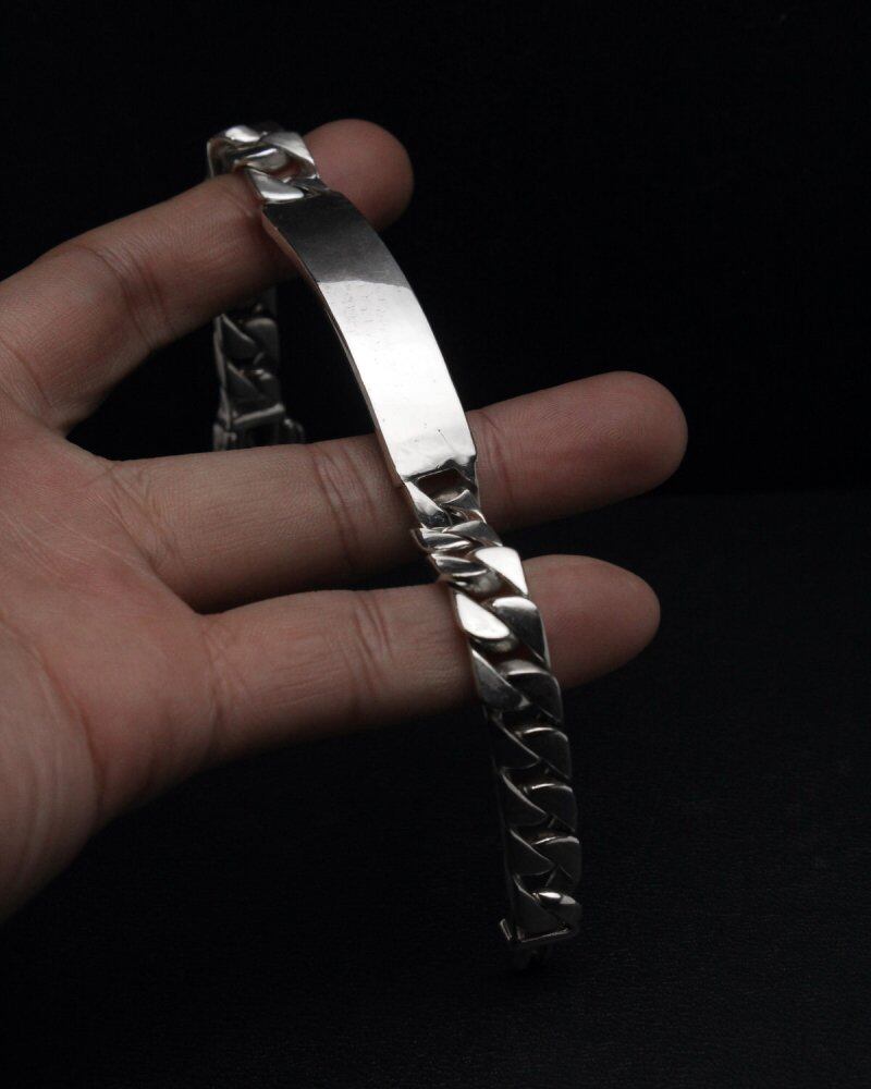 A hand-engraved Italian ID bracelet that is no longer in use. It gained popularity as a fashion jewelry from the fact that it was sold (supplied) to soldiers during the war. This is probably old and from the 1980s to the late 90s even if it is new. A special one that has a moist texture throughout and an engineering design that conforms to the human body and a profound feeling. An Italian Kihei chain that you cant find if you look for it, an initialless design. In order to show the texture unique to USED, it is not polished. The current Tiffany size is about XL, which can be worn by slim men and women. Please check the photos and understand the characteristics of vintage before purchasing.